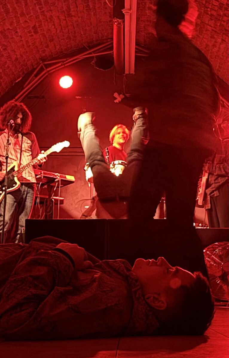 Αυτή είναι η αγαπημένη μου φωτογραφία. Ένας τύπος τύφλα στα ποτά έχει λιποθυμήσει ενώ παίζουμε. Ο Διονύσης κάνει backflip / breakdance (?) πάνω στο stage και μια τύπισσα απλά χορεύει σαν να μην τρέχει τίποτα…