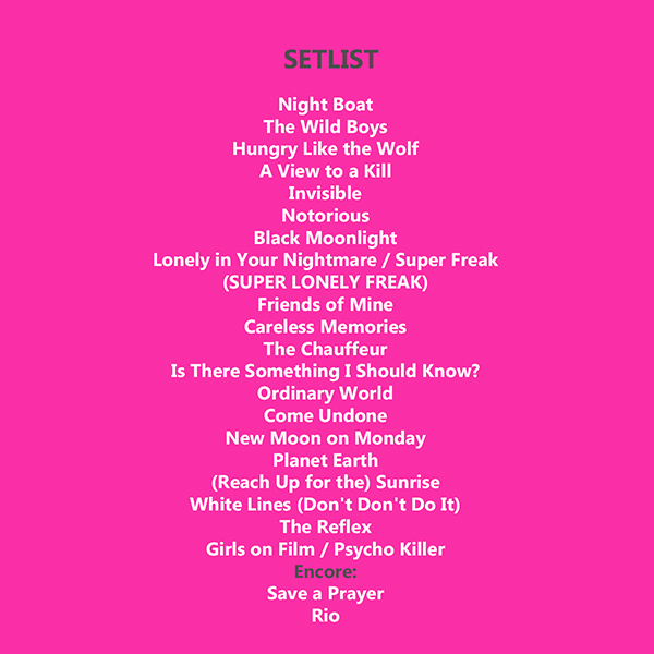 Το setlist γενικά ήταν πραγματικά ένα best of και πολύ το χάρηκα γιατί είχα δει ότι στα τελευταία live τους έλειπαν πολλά αγαπημένα old time classics και είχα ανησυχήσει. Ευτυχώς με καθησύχασαν και δεν πήρα ανάσα μέχρι το τέλος. Από το Hungry Like the Wolf, το A View to a Kill και το Notorious, μέχρι το Is There Something I Should Know?, το New Moon on Monday, το White Lines (Don’t Don’t Do It) και το The Reflex, ένα ατελείωτο εφηβικό πάρτυ.
