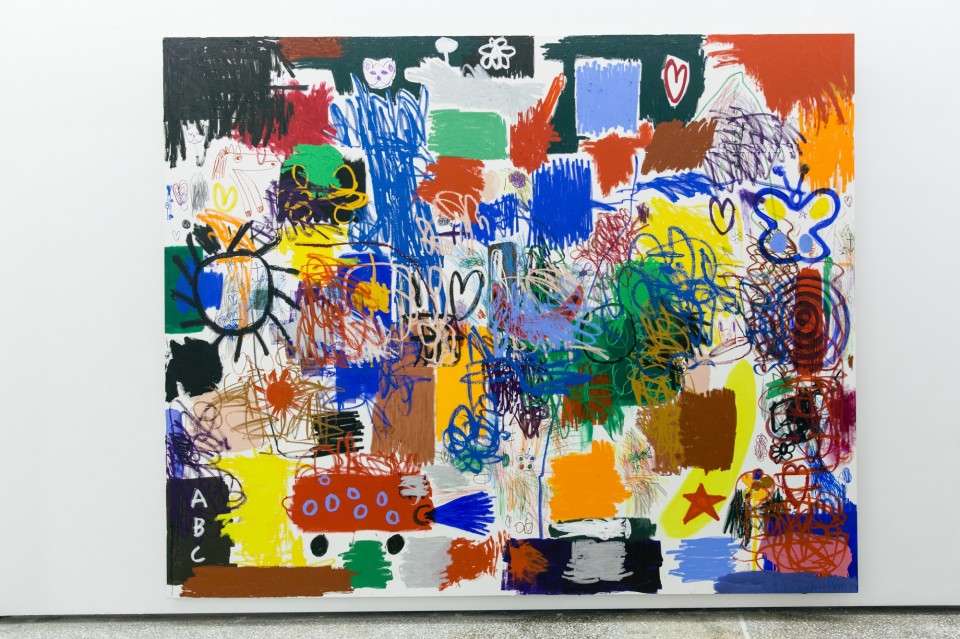 Στο ισόγειο, όπου τα πλήθη κρατώντας μια μπύρα στο χέρι ξεχύνονταν στον πεζόδρομο του αγοραίου έρωτα αγγίζοντας με την ουρά τους τα πορνεία, μπουρδουκλωμένα με την πελατεία και με το προσωπικό τους, κυριαρχούν οι νέες σημαίες μιας νέας χώρας. Η γειτνίαση του έξω κόσμου με το εικαστικό σύμπαν του Βαρελά είναι συναρπαστική και σουρεαλιστική ταυτόχρονα. Εδώ, στο ισόγειο, συναντάς στο ακέραιο τον τίτλο της εγκατάστασης και είναι κάτι που, υποθέτω, αποτελεί ευχή για πάρα πολλούς. Στα τεράστια ταμπλό το χρώμα είναι ατίθασο κι οργιώδες. Προβάλλουν κάποια σύμβολα αφαιρετικά, αλλά το σχήμα, η μορφή δεν αποτελούν το πρόταγμα. Ο καλλιτέχνης που πλέον ζει και δημιουργεί μεταξύ Λος Αντζελες, Βιέννης και Αθήνας, αρνείται να μπει σε καλούπι ή να βάλει σε καλούπι το έργο του κι αντιστέκεται σε οποιαδήποτε επιταγή. Κυρίως, ιδεολογική. Η ενότητα αυτή είναι συντεταγμένη, όπως ο ίδιος υποστηρίζει, στους αντίποδες των trendy εννοιών της ανταγωνιστικότητας, της αποδοτικότητας και της παραγωγικότητας.