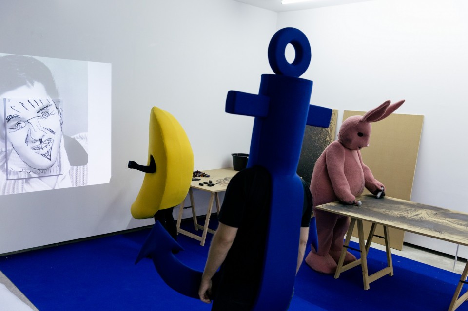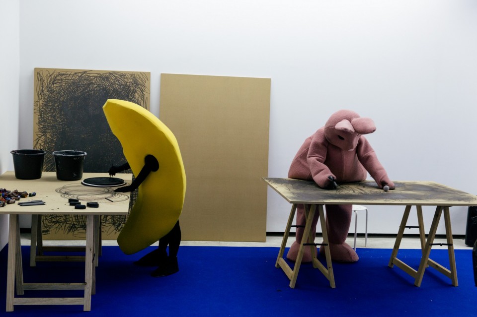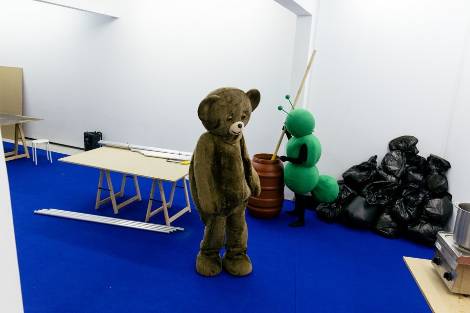 To βράδυ της 24ης Σεπτεμβρίου στο υπόγειο της The Breeder στην Ιάσονος γινόταν πανικός. Πέντε παράξενα, γκροτέσκα πλάσματα, μια πελώρια δίποδη μπανάνα, ένας αρκούδος, ένα κουνέλι, μια κάμπια και μια άγκυρα (!) σε ανθρώπινο μέγεθος μουτζούρωναν επιφάνειες στον τοίχο και μια αφίσα του Έλβις, ανακάτευαν και μετέφεραν μείγματα, σαν τα ρομπότ που βρίσκονται στον αυτόματο. Η νέα ζωντανή εγκατάσταση του Γιάννη Βαρελά στην έκθεση New Flags for a new country κάνει ένα πολιτικό σχόλιο στην καταναγκαστική διαβίωση, συμβίωση και στην εργασία-κάτεργο της νέας εποχής, φλερτάροντας με μοτίβα της pop κουλτούρας και τον Γουόρχολ. Βεβαίως, ο ίδιος προτιμά να μιλά για το επαναστατικό θέατρο του ’50 και του ’60 στο Σαν Φρανσίσκο και για τη δουλειά του Ronnie Davis και του San Fransisco Mome Troupe.