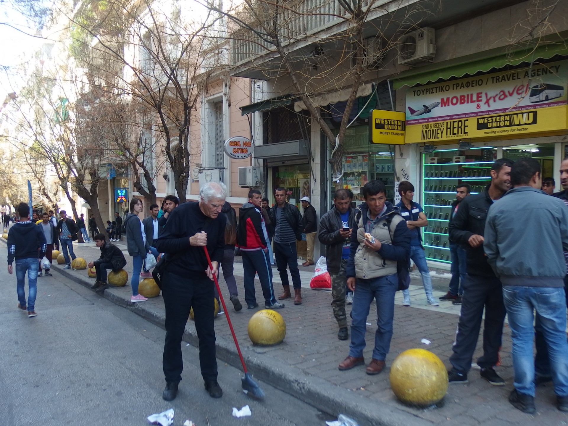 Tην Κυριακή οι πρόσφυγες είδαν έναν θεόρατο ασπρομάλλη άνδρα να σκουπίζει σοβαρά το δημόσιο χώρο που έγινε ο χώρος διαμονής τους. «Οι άνθρωποι αυτοί ήταν συγκλονιστικοί. Ερχοντουσαν και μου έλεγαν ευχαριστώ. Μου φέρναν και σκουπίδια που δεν είχα δει να τα μαζέψω». Ο Δήμος δεν καθαρίζει; «Περνά μια φορά τη μέρα. Αλλά εμένα δεν με ενδιαφέρει ο Δήμος. Μ’ενδιαφέρει η σχέση του καλλιτέχνη με το κοινωνικό περιβάλλον. Ηθελα να κάνω μια προσφορά στο χώρο του πρόσφυγα, να του τον ξεβρωμίσω». Τι κάνουν οι ομότεχνοί του, οι καλλιτέχνες γενικότερα, τους οποίους δεν τους έχουμε ακούσει τελευταία που το προσφυγικό είναι έτοιμο να εκραγεί; «Οι καλλιτέχνες, όπως όλος ο λαός, περιμένουν τον αναπτήρα να ανάψει. Βεβαίως και είναι τεράστιες οι ευθύνες των καλλιτεχνών, αλλά περνάνε τη φάση της μαζοχιστικής ενοχής», εκτιμά ο εικαστικός.