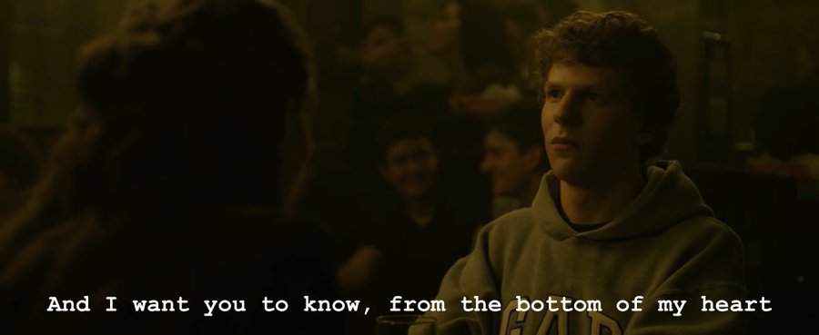 Στην παρακάτω κλασική πλέον εναρκτήρια σκηνή της ταινίας, η Ρούνεϊ Μάρα συνοψίζει με συγκλονιστικά ακριβή τρόπο την προσωπικότητα του Ζάκερμπεργκ (που υποδύθηκε με ρομποτική εγωπάθεια ο Τζέσι Άιζενμπεργκ), η οποία θα αποκαλυπτόταν σε όλο τον πλανήτη με κάθε νέο σκάνδαλο από τα πολυάριθμα που μαστίζουν τον ίδιο και την εταιρεία του τα τελευταία χρόνια. Τότε ήταν μια έξυπνη ατάκα. Τώρα είναι η εξήγηση για την παρανοϊκή τροπή της παγκόσμιας κουλτούρας τον 21ο αιώνα από έναν ευφυή, απωθητικό νεαρό που ο Φίντσερ τόλμησε στην αυγή της κυριαρχίας του να περάσει μέσα από τη μηχανή του κιμά.