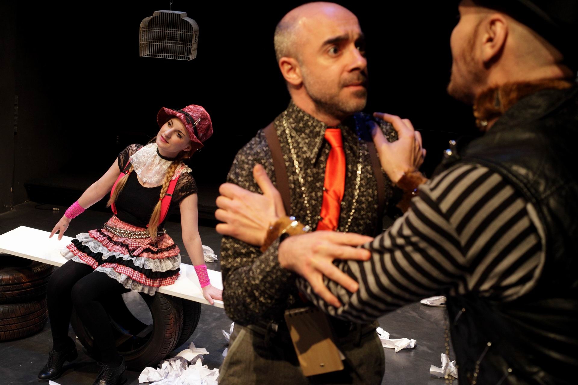 Το έργο λοιπόν που δημιουργήσαμε βασίζεται πάρα πολύ στη «Φαλακρή Τραγουδίστρια» κι έχει δάνεια από το «Μάθημα» του Ιονέσκο κι από τον Τσέχωφ έχουμε βασιστεί στις «Τρεις αδερφές», την «Αρκούδα» ενώ υπάρχει αναφορά και στον «Βυσσινόκηπο». Υπάρχει ένα εύρημα στο τέλος που εν μέρει δικαιολογεί για το τι συμβαίνει όλο αυτό.