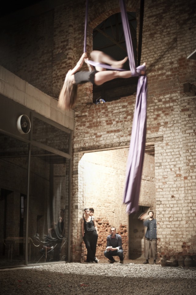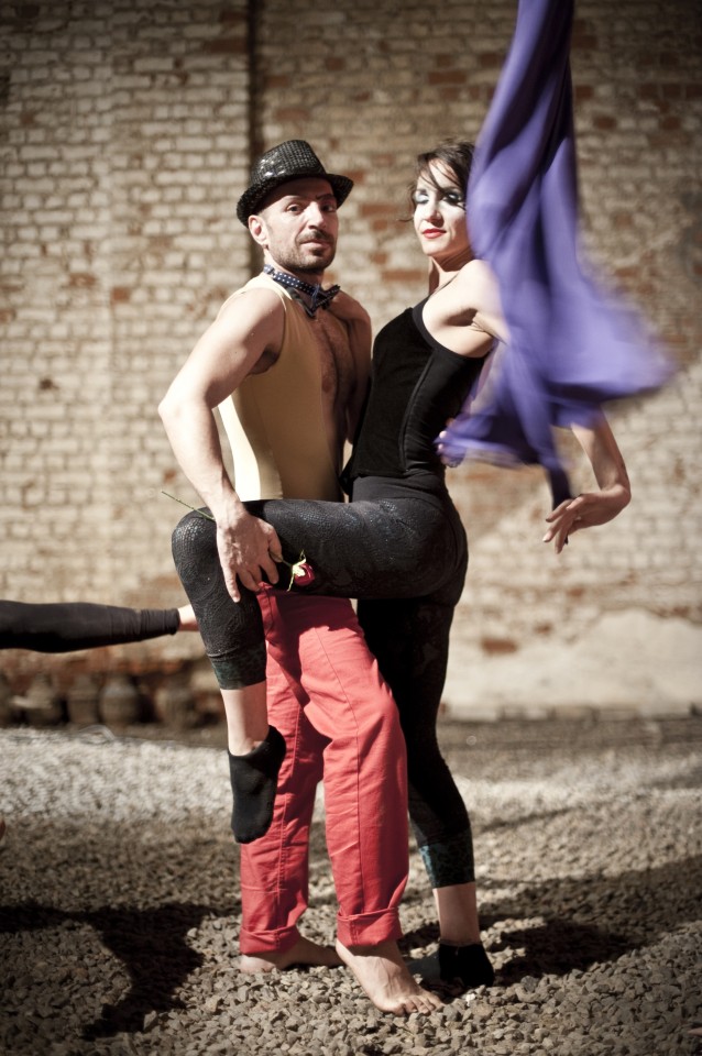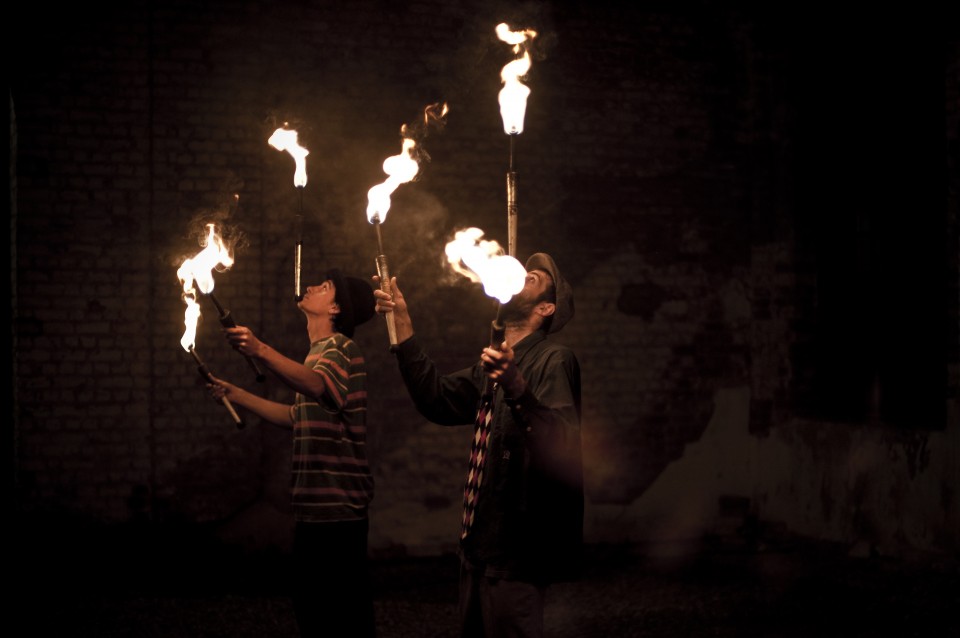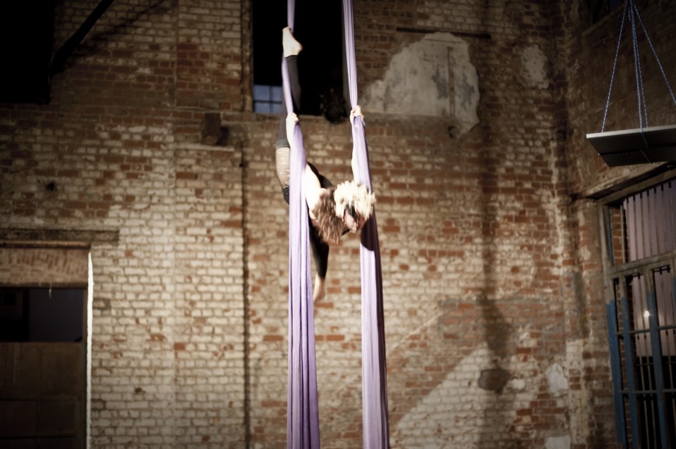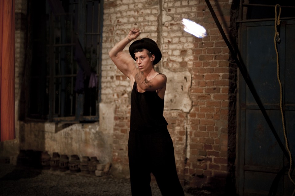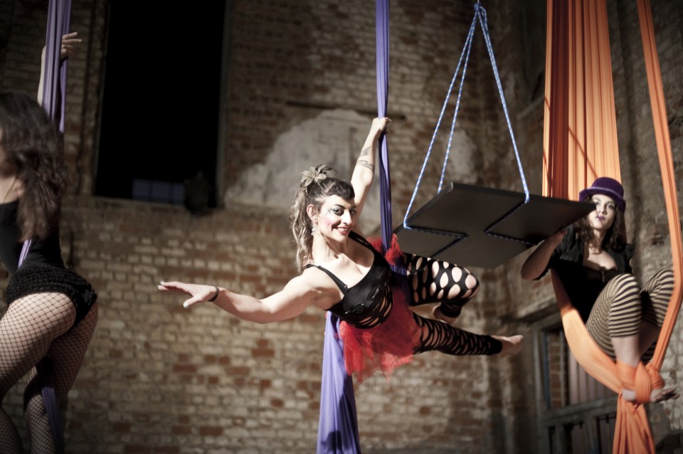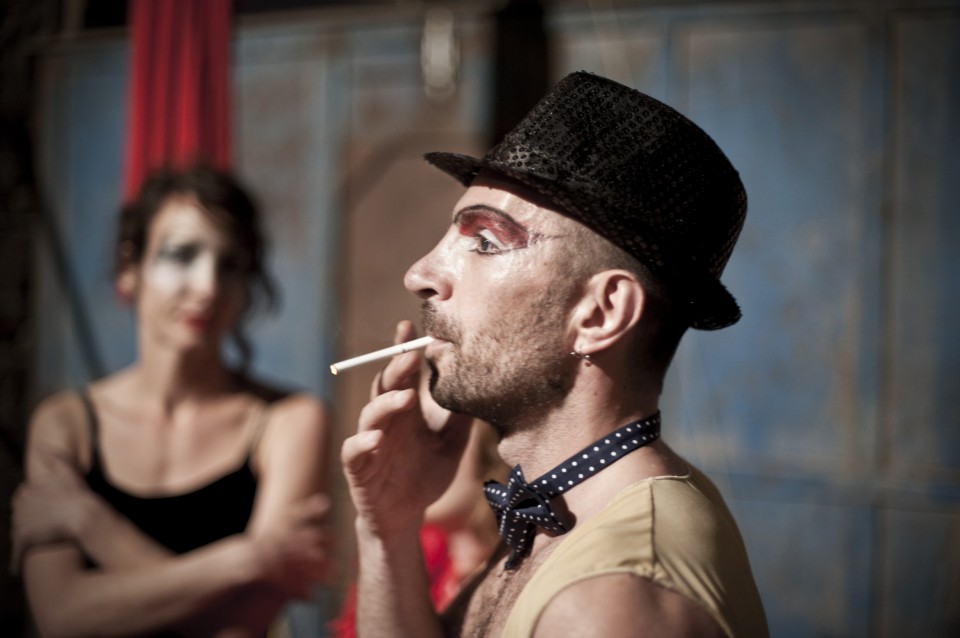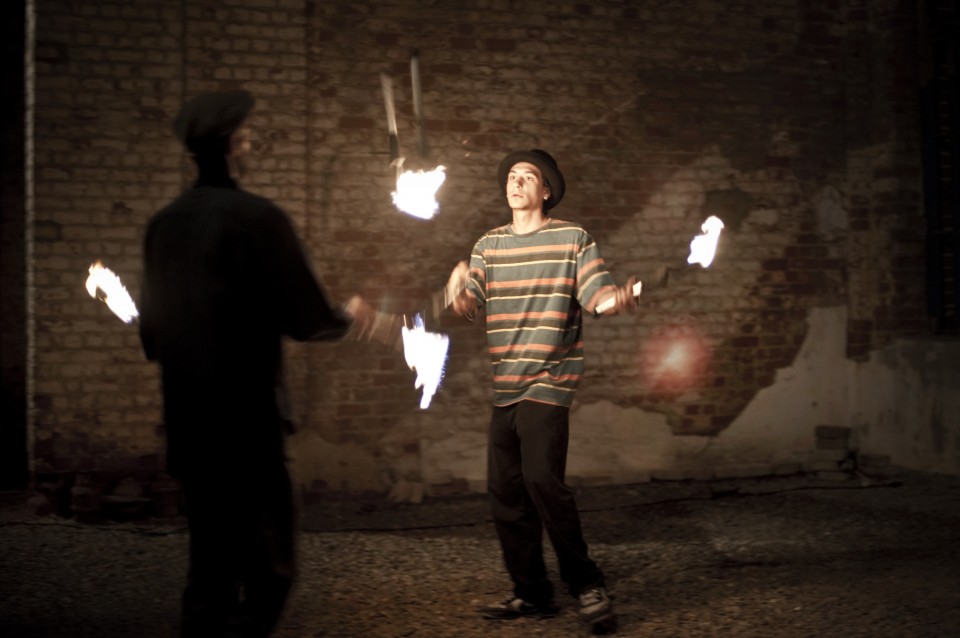 Οι εναέριοι χορευτές της Θεσσαλονικιώτικης ομάδας Aerialistic κάνουν ζέσταμα και μελετούν ξανά και ξανά το νούμερο που θα εκτελέσουν. Λίγο πιο δίπλα, οι τροχιές που αφήνουν πίσω τους οι φωτιές στα χέρια των ζογκλέρ αιχμαλωτίζουν το βλέμμα αμέσως. Η ατμόσφαιρα θυμίζει καμπαρέ, αλλά κανείς δεν χαλαρώνει όσο η ομάδα ετοιμάζεται για την αποψινή πρεμιέρα.