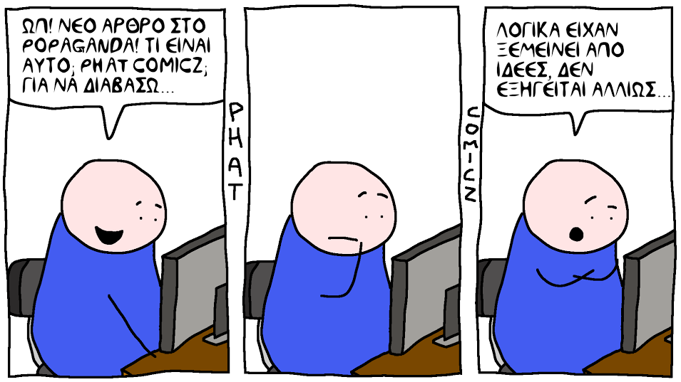 Είναι κάποιοι μήνες τώρα που εντόπισα τη σελίδα των Phat Comicz στο facebook. Κάποιος φίλος είχε κάνει like σε ένα από τα σκίτσα, το διάβασα, γέλασα, μπήκα να διαβάσω περισσότερα. Kόλλησα.