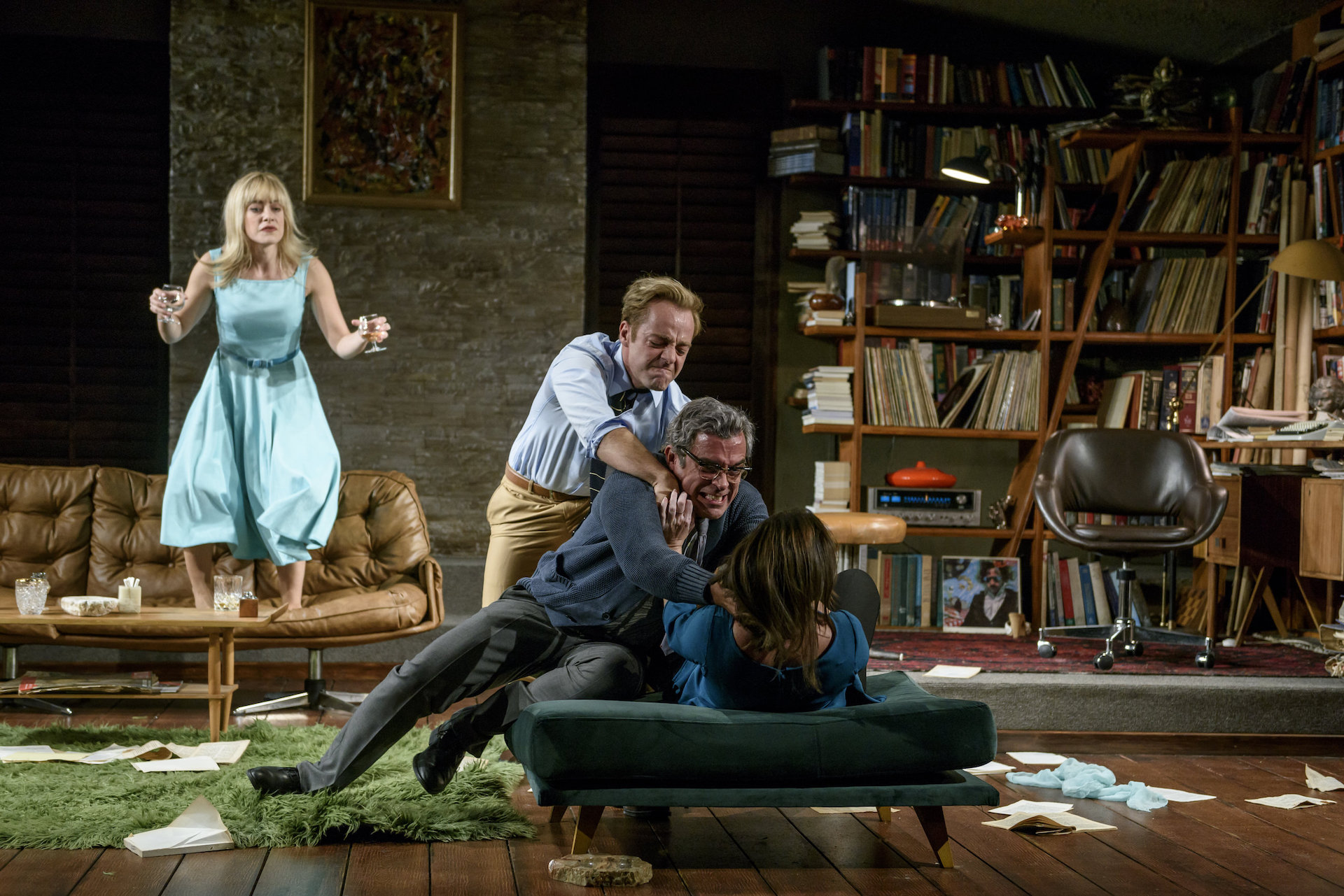 Στη σκηνή του Θεάτρου «Αθηνών» έχει στηθεί ένα σαλόνι της δεκαετίας του ’60. Ενα σαλόνι ανθρώπων που αγαπούν τα βιβλία, οπωσδήποτε, αλλά καθόλου την τάξη (σκηνικά Αθανασία Σμαραγδή). Ακούγεται το σαρωτικό γέλιο της Μάρθας (Μαρία Πρωτόπαπα) που μπαίνει μισομεθυσμένη και ακολουθείται από τον υπομονετικό Τζωρτζ (Κωνσταντίνος Μαρκουλάκης), τον οποίο προστάζει να κατευθυνθεί στον… συμπρωταγωνιστή της παράστασης, το μπαράκι στην άκρη της σκηνής. Καταφυγή, διέξοδος, εκτόνωση, συντροφιά είναι το αλκοόλ γι’ αυτό το ώριμο, αλλά κουρασμένο ζευγάρι, που από την είσοδο έχει αρχίσει το πινγκ πονγκ της αλληλοακύρωσης: «Αν υπήρχες θα σε χώριζα» λέει η Μάρθα. «Εχεις σαρώσει όλα τα βραβεία βδελυγμίας» απαντά ο Τζωρτζ.