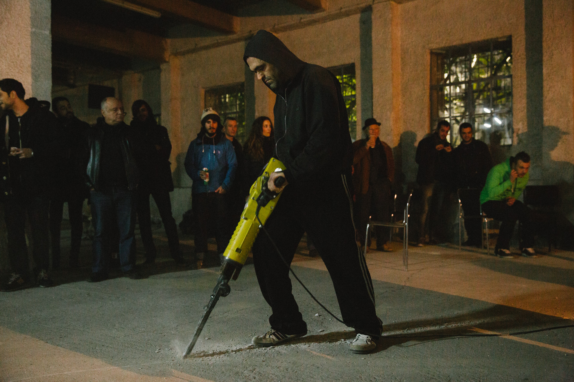 Ο χειριστής του κομπρεσέρ, λοιπόν, σκεπασμένος με μια κουκούλα, ξεκινάει να τρυπάει το έδαφος διασχίζοντας διαγώνια την αίθουσα. Και είναι ένα παράδοξα συναρπαστικό θέαμα. Μια πράξη «βανδαλισμού». Μια πανκ χειρονομία καταστροφής. Ποιος από εμάς δεν έχει φαντασιωθεί πως κάνει άνω-κάτω το γραφείο του στριμμένου του αφεντικού; Ποιος δεν σκέφτηκε έστω και μια φορά να βάλει φωτιά στο κτήριο της εφορίας που ανήκει; Ίσως έτσι εξηγείται το ότι όσοι παρακολουθούν απόψε το τσιμέντο να σπάει, δονούμενοι από τον έντονο θόρυβο, χαμογελούν… Όταν ο χειριστής μετά από δεκαπέντε περίπου λεπτά ασταμάτητης χρήσης του μηχανήματος έχει φτάσει στην άλλη άκρη, στον απέναντι τοίχο, με το πλήθος να τον ακολουθεί, ο θόρυβος σταματάει και μέσα στο βουητό ακούγονται τα πιο θερμά χειροκροτήματα. Βγάζει την κουκούλα, χαμογελάει, δέχεται το φιλί μιας κοπέλας, χαμογελάει ξανά.