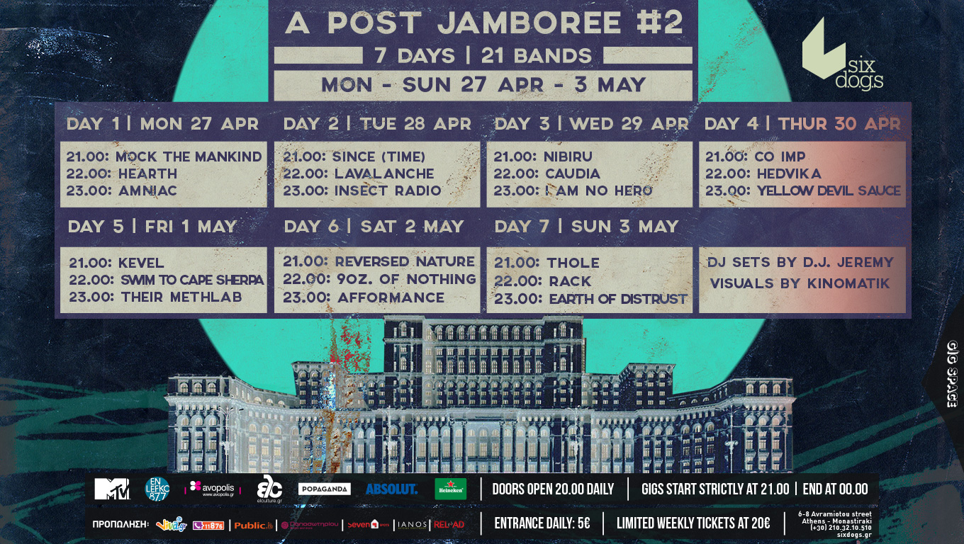 Τη στιγμή που τελείωσε το περσινό A POST JAMBOREE #1 είχε γίνει η αρχή μία υπέροχης ιδέας: να στηθεί ένα mini-fest που να στηρίζει τον ήχο που στηρίζει πολύ έντονα το six d.o.g.s τα τελευταία τρία χρόνια. Δηλαδή τον post ήχο με την ευρεία έννοια του. Γίνονται συνεχώς live προς αυτή την κατεύθυνση, οπότε ήταν αυτονόητο και απαραίτητο να μαζέψουν την κρεμ ντε λα κρεμ του είδους και να στήσουν μία ολοκληρωμένη πρόταση αφιερωμένη σε αυτό ακριβώς το πράγμα.