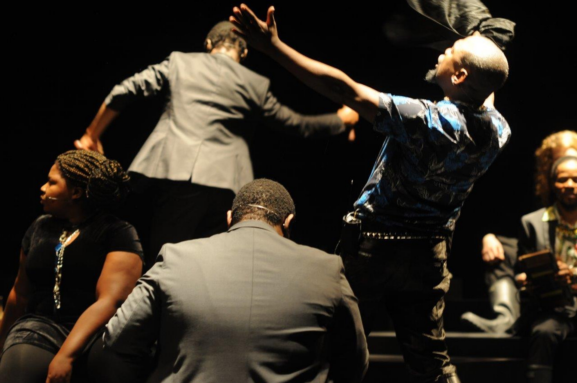 Δηλαδή; Russell: Άλλος χορεύοντας, άλλος γράφει στο νεκρό ένα γράμμα, άλλος του απαγγέλει ένα ποίημα. Στην Αφρική γενικά στις κηδείες καλούμε μουσικούς να παίξουν, υπάρχει αλκοόλ, άλλοι θα φέρουν φαγητό, είναι σαν γιορτή. Κλαίμε, μέχρι μια στιγμή, που δεν κλαίμε πια, γιορτάζουμε εκφράζουμε αλλιώς το συναίσθημα, δεν συγκρατούμαστε. Γιατί η οδύνη κάποιες φορές εκφράζεται με διαφορετικούς τρόπους. Υπάρχουν άνθρωποι που όταν πονάνε, αστειεύονται. Ένας από τους τραγουδιστές μας στην ομάδα που έκανε αυτή την παράσταση, όσο κάναμε πρόβες έχασε τη μητέρα του. Μας ανήγγειλε το νέο κι αναρωτηθήκαμε πώς θα καταφέρει να συνεχίσει. Αυτός μας αγκάλιαζε, έκανε αστεία. Δεν καταλαβαίναμε: χτες πέθανε η μητέρα του. Κι ήταν εκεί ήρεμος, κι αυτό μας μπέρδευε όλους. Μέχρι που κάποια στιγμή ξέσπασε, κι άρχισε να κλαίει. Ο καθένας λοιπόν έχει το δικό του τρόπο να εκφράζεται, να αποφορτίζεται, να ξεσπάει. Γιατί αν τα κρατάει όλα μέσα του, κινδυνεύει να εκραγεί. Boule: Έτυχε πρόσφατα εδώ, στην Ευρώπη, να παραστούμε σε μια κηδεία. Παρατηρήσαμε πως τα έθιμα είναι σχεδόν ίδια με τα δικά μας, όμως όλοι ήταν απόλυτα σοβαροί. Θυμάμαι πως μετά τη λειτουργία έβαλαν το αγαπημένο τραγούδι του προσώπου που είχε πεθάνει. Παρόμοια κάνουμε κι εμείς, αλλά δεν είμαστε τόσο συγκρατημένοι.