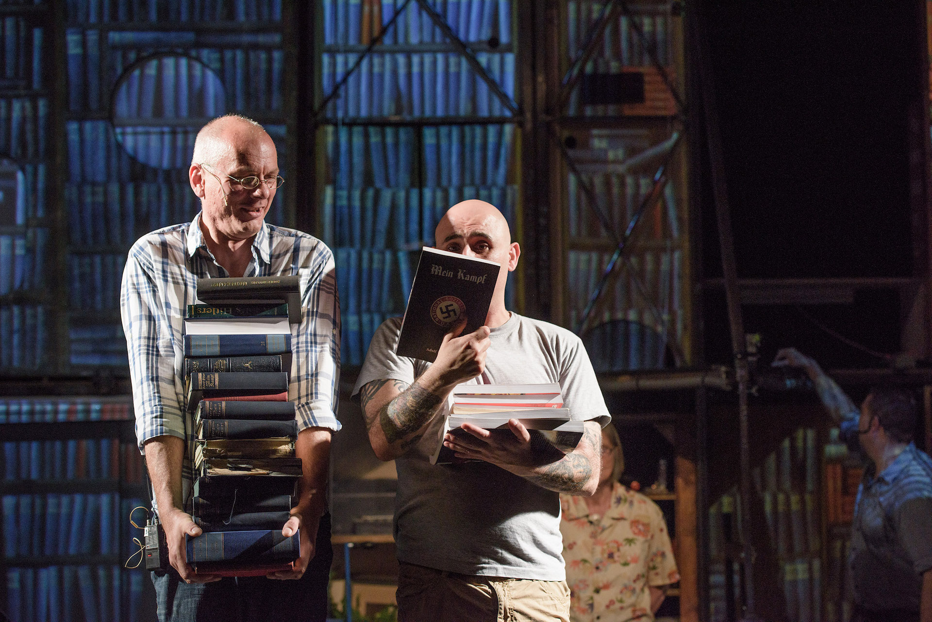 Και οι πέντε performers δεν είχαν ξανανεβεί στη σκηνή: η ιστορικός που ειδικεύεται στα γυναικεία ζητήματα, ο δικηγόρος από το Τελ Αβίβ, η Γερμανίδα συνάδελφός του που ασχολείται με τα πνευματικά δικαιώματα, ο συντηρητής παλιών χειρογράφων που εργάζεται στη βιβλιοθήκη της Βαϊμάρης (και όχι μόνο δεν ήθελε να μετάσχει, αλλά είχε αντιρρήσεις και για το συνολικότερο εγχείρημα της παράστασης) και ο hip hop μουσικός και εθνολόγος με τουρκικές καταβολές που εκπροσωπεί το μετανάστη στη Γερμανία («Μιλά για το ρατσισμό του να είσαι Γερμανός αλλά να θεωρείσαι Τούρκος»). Η δικηγόρος διάβασε το βιβλίο όταν ήταν έφηβη κι «έχει μια πολύ συγκροτημένη και σαφή άποψη, έχει δουλέψει με το βιβλίο». Ο Εβραίος δικηγόρος διάβασε το έργο σε πολλές γλώσσες και έχει επίσης δουλέψει πολύ πάνω του. «Οι προσεγγίσεις του καθένα είναι διαφορετικές». Ενα μέρος της παράστασης είναι η ανάγνωση αποσπασμάτων του «Mein Kampf» από τον τυφλό που συμμετείχε στην παράσταση του «Kεφαλαίου» του Μαρξ το 2006.