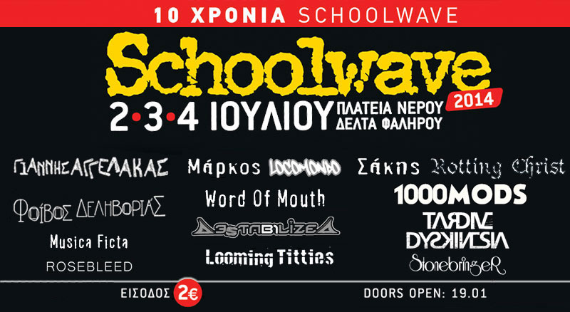 Στη δέκατη επέτειό του λοιπόν , το Schoolwave επιστρέφει στην Πλατεία Νερού του Φαλήρου, καλώντας μας όλους να συμμετάσχουμε σε μια τεράστια γιορτή για τη μουσική και το καλοκαίρι. Στο φεστιβάλ συμμετέχουν 12 μαθητικά και 12 φοιτητικά συγκροτήματα, όπως επελέγησαν από την κριτική επιτροπή που αποτελείται από τους Γιάννη Πετρίδη (ραδιοφωνικό παραγωγό), Νίκο Κυπουργό (συνθέτη), Γιώργο Κουμεντάκη (συνθέτη), Vassilikos (τραγουδοποιό), Σάκη Τόλη (Rotting Christ), Φοίβο Δεληβοριά (τραγουδοποιό), Χρυσόστομο Μουράτογλου (μουσικό παραγωγό) και Χρήστο Ιωαννίδη (Schooligans).