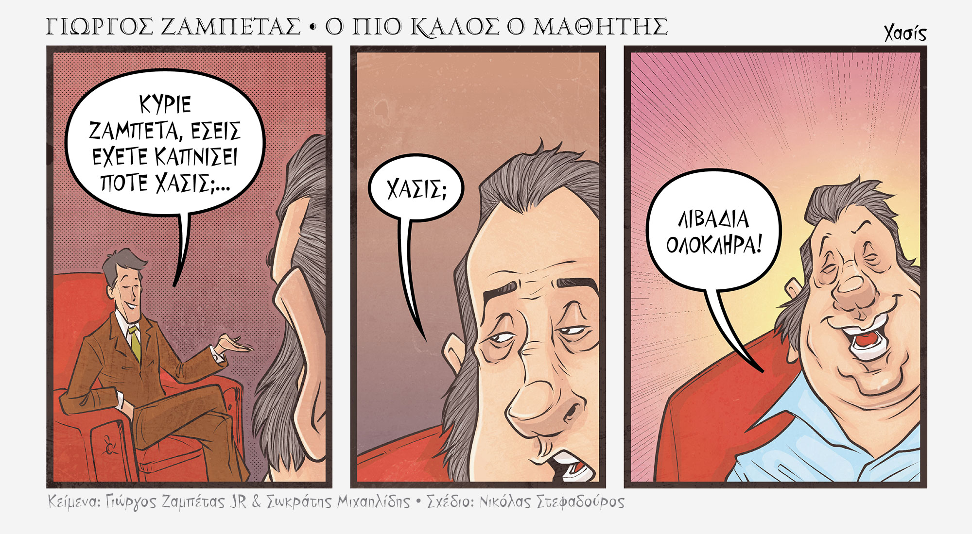 Ποιος όμως είναι αυτός που ανέλαβε να τον ζωντανέψει ξανά μέσω των σκίτσων του και να οπτικοποιήσει αυτά τα σύντομα επεισόδια, που είναι τόσο αντιπροσωπευτικά της Ζαμπετικής νοοτροπίας; Ο Νικόλας Στεφαδούρος, που διακρίθηκε στο comicdom του 2016 ως ο Καλύτερος Νέος Καλλιτέχνης, φέρνει εις πέρας αυτή την αποστολή και μιλάει στην Popaganda για το κόμικ και τη μέχρι τώρα πορεία του.