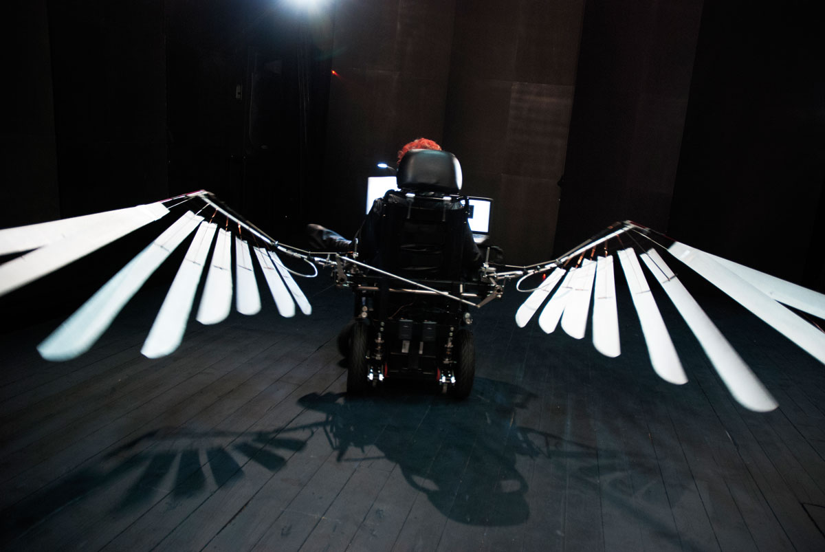 Η Άννα έχει μεταμφιεσθεί σε ένα άφυλο ον, εξώκοσμο και τεθωρακισμένο πίσω από το μαύρο δερμάτινο όστρακο των μοτοσικλετιστών Αγγέλων της Κόλασης, που την καλύπτει και ακυρώνει το σώμα της από την κορυφή ως τα νύχια. Πρόσωπο χλωμό και σαν νεκραναστημένο, μαλλιά όρθια που φυτρώνουν σαν φλογίτσες ενός εμπύρετου μυαλού. Το ένα μάτι άσπρο, σαν χυμένο. Γυαλιά με χοντρούς φακούς, σκελετό κομμένο στη μέση, σαν ημικύκλια που το άλλο μισό τους παράπεσε στην αρχαιότητα. Τα πόδια σφηνωμένα σε μαύρα στιβάνια υπάκουα ακινητοποιημένα στις επιταγές της «πολεμικής μηχανής» – έτσι ονομάζει η ηθοποιός την ηλεκτροκίνητη αναπηρική καρέκλα μέσα στην οποία δέχεται τα μηνύματα από το παρελθόν. Η πολεμική μηχανή, μέσα από την οποία εξορμά το μέντιουμ, που θα ανακαλέσει απόψε για μας στη σφενδόνεια συνεδρία τον Πατέρα της Ιστορίας, έχει μεταλλόχρωμα ανάλαφρα φτερά. Τα έχει σχεδιάσει και κατασκευάσει ο μηχανικός, ο ανυπέρβλητος Δημήτρης Κορρές για να τη βοηθήσει να πετάξει. Η ίδια απογειώνεται μ’αυτά και μας παίρνει κι εμάς μαζί της ψηλά, απάνω από τον στρογγυλό κόλπο της Σικελίας, εκεί που έγινε το μεγάλο μακελειό. Την ακολουθούμε πετώντας και ζούμε το θάνατο στη θάλασσα, τόσο μακριά από τα χωρικά μας ύδατα. Ποτέ η Αδριατική δεν υπήρξε πιο μισητή, έτσι όπως την είδαμε με τα φτερά της ηθοποιού.