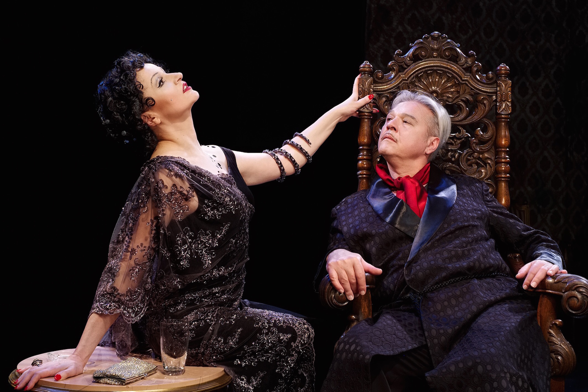 Θαμπωμένοι από την επιβλητική παρουσία της Norma Desmond στην οθόνη, με ένα τελευταίο πλάνο που αποκαλύπτει όλο το θυμό, την απόλυτη αποφασιστικότητα και την παράνοια αυτής της τόσο baroque προσωπικότητας, περνάμε από την οθόνη του σινεμά στην «οθόνη» του θεάτρου ή μάλλον της θεατρικής σκηνής. Το τελευταίο δεν είναι μόνο ένα σχήμα λόγου αλλά απορρέει και από την επιμέλεια με την οποία έχει δοθεί το κάδρο της θεατρικής αναπαράστασης: ένα προκατασκευασμένο πλαίσιο περιβάλλει τη σκηνή μέσα στην οποία θα λάβει χώρα η θεατρική πράξη, παραπέμποντάς μας σε κινηματογραφική οθόνη. Μέσα σε αυτό, εμφανίζεται μπροστά μας τώρα με «σάρκα και οστά» -και όχι η αντανάκλαση του ειδώλου της, όπως στο σινεμά- η Norma Desmond με το ίδιο θανατηφόρο και διεισδυτικό βλέμμα που παγώνει, χάρη στην εξαιρετική performance της Καρυοφυλλιάς Καραμπέτη η οποία καταφέρνει να γίνει ένα με το παραπάνω πρόσωπο. Ενδεδυμένη με την ίδια αστραφτερή τουαλέτα, φέροντας ακόμη και τις πούλιες στον ώμο, στέκει εκεί, μπροστά μας και μας καθηλώνει. Δίπλα της ένας γέρος, κουρασμένος από τη ζωή και τους ανθρώπους, ο μέγας Erich Von Stroheim βιδωμένος σε μια πολυθρόνα, απηυδισμένος από τις καταστάσεις και περιμένοντας το θάνατο. Ο Άκις Βλουτής μέσα σε μια ρόμπα ηλικιωμένου και με παντούφλες ενσαρκώνει πειστικά ένα βασανισμένο σκηνοθέτη, ενώ λίγο πιο πέρα στέκει η Denise, η τελευταία σύντροφος της ζωής του (Αγλαΐα Παππά), η οποία είναι προσηλωμένη καθ’ όλη τη διάρκεια του έργου στη σχολαστική πράξη του σιδερώματος.