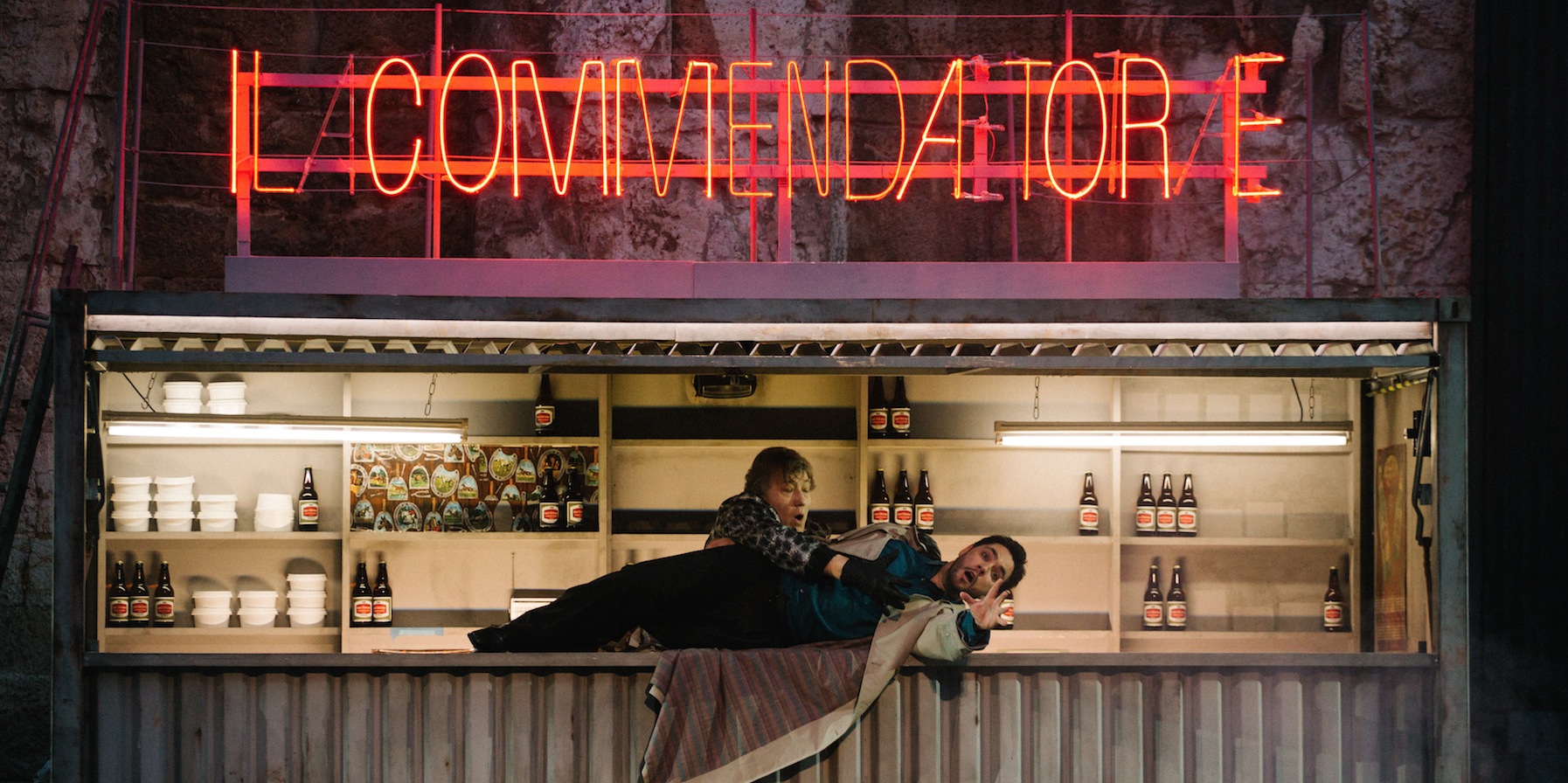 Σε ένα μισοκατεστραμένο από το χρόνο και τους ανθρώπους σκηνικό, επινοημένο από την ταλαντούχα Εύα Μανιδάκη, με μια καντίνα, στην κορυφή της οποίας αναβόσβηναν δραματικά κόκκινοι τίτλοι, στύλους φωτισμού και άστεγους που ξάπλωναν ή περιφέρονταν μεθυσμένοι, παραπέμποντας ευθέως στις «κουλτούρες του δρόμου», ο Ντον Τζοβάννι ήρθε, για να ταράξει τα ήθη μιας πόλης και τις καρδιές των γυναικών. Κι όχι μόνο αυτών, αλλά και ίδιου του κοινού, το οποίο έμεινε άναυδο στη σκηνή που ο ήρωας του έργου, ως άλλος βρυκόλακας, δείπνησε καταβροχθίζοντας το αίμα από τις ερωμένες του, που σωριάστηκαν, κατόπιν, ξέπνοες στη σκηνή.