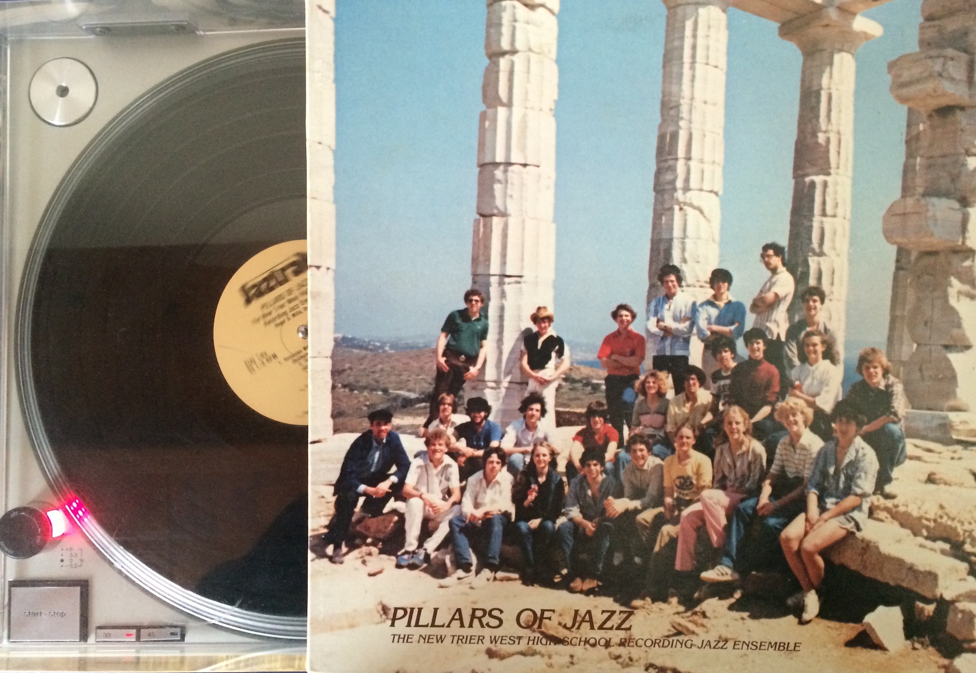 Ο λόγος για τους The New Trier High School Recording Jazz Ensemble, ένα φοβερό σχολικό ανσάμπλ απο την Αμερική που επισκέφτηκε την χώρα μας για δύο live εμφανίσεις τη δεκαετία του 70, όπως αναφέρεται στα liner notes στο πίσω μέρος του δίσκου, και που δεν έχω ακούσει ή διαβάσει τίποτα για δαύτους όλα αυτά τα χρόνια που έχω στην κατοχή μου το βινύλιο Pillars of Jazz. Μια συναυλία λοιπόν στην Αθήνα και μια στην Καβάλα (!) αφού επισκέφτηκαν και τα αρχαία στην πρωτεύουσα αλλά και την Θεσσαλονίκη όπως οι ίδιοι αναφέρουν λεπτομερώς στα πλαίσια της περιοδίας-εκδρομής τους. Αυτό δεν σημαίνει απαραίτητα πως οι συναυλίες ήταν κανονισμένες εξαρχής. Υποθέτω πως απλά σεταρίστηκαν τελευταία στιγμή. Συμβαίνει συχνά. Χαρακτηριστικό είναι το cover του βινυλίου που δείχνει την σχολική μπάντα φωτογραφισμένη στο Σούνιο.