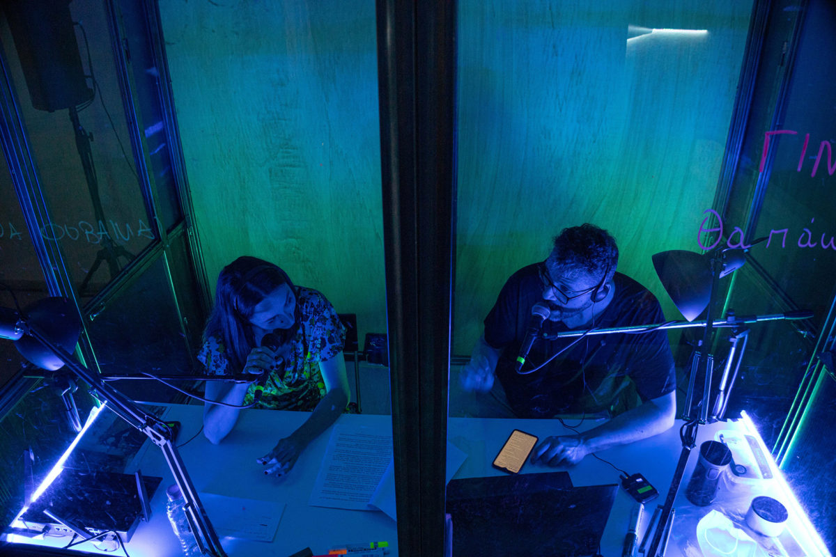 «Αυτό το ρωτάνε πολλοί, ελπίζω να μην θέλουν να μου πουν κάτι… Αστειεύομαι, απόλαυσα τρομερά τη διαδικασία Podcasts που κάναμε πριν την παράσταση με πέντε εξαιρετικούς, ξεχωριστούς καλεσμένους, τη Βαρβάρα Σαββίδη, τη Λίνα Ρόκου, τον Λευτέρη Σταύρακα, τον Δημήτρη Παπανικολάου και τον Αντώνη Λιάκο. Θα μου άρεσε λοιπόν να κανω ραδιόφωνο, ναι. Η ζωντανή του διάσταση και ταυτόχρονα η αίσθηση ότι λειτουργείς στο κομμάτι το ηχητικό περισσότερο, αφού δεν σε βλέπουν, μου φαίνεται γοητευτική. Άλλωστε τη συνθήκη αυτή τη χρησιμοποιήσαμε πέρα από την οικειότητα που δημιουργεί και πέρα από το γεγονός ότι σαν παιδί και έφηβος άκουγα πολλές ώρες ραδιόφωνο και έγραφα και κασέτες -δεν είμαι τόσο μεγάλος, στο τέλος τους τις πρόλαβα- γιατί μια ηχητική δραματουργία απευθύνεται πολύ περισσότερο στο υποσυνείδητο. Ατομικό και συλλογικό. Στην ουσία πατάμε στην παράδοση αυτού που στα γερμανικά θα λέγαμε Hörspiel, αλλά το θέμα μας δεν είναι να επαληθεύσουμε παραδόσεις ή να πούμε ποια είναι η καλλιτεχνική καταγωγή μας. Να μιλήσουμε για εμάς, για τις ζωές μας θέλουμε, βλέποντάς τες εντός ιστορικού χρόνου και όχι υιοθετώντας έναν αφελή παροντισμό».