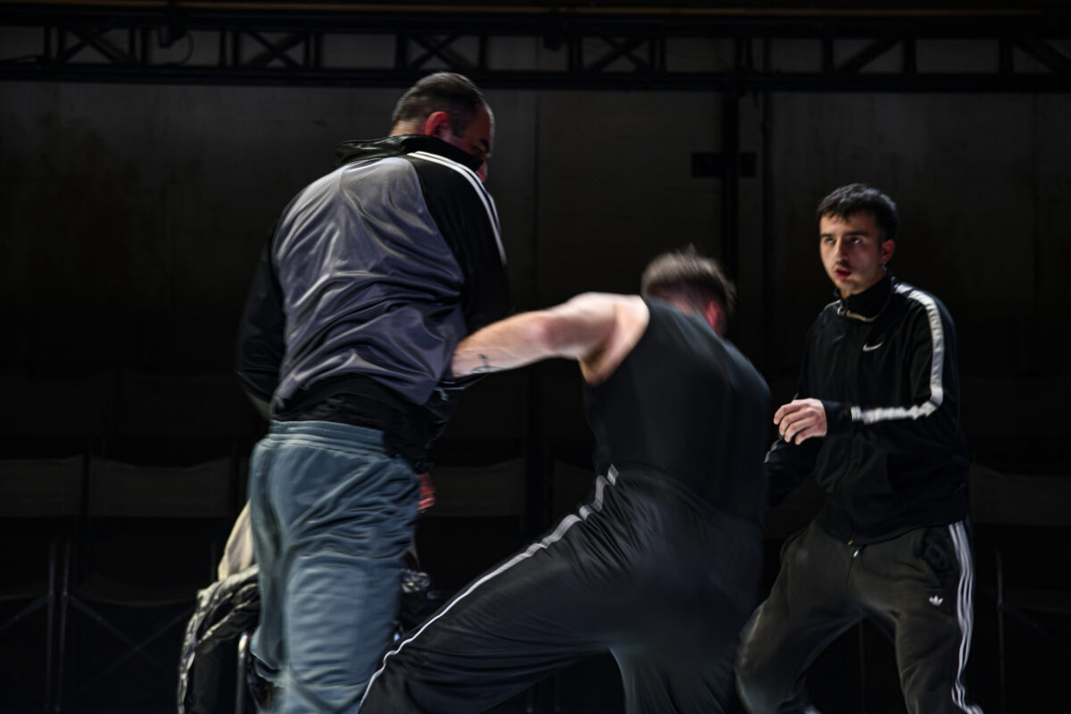 Ο κεντρικός ισόγειος χώρος στο Δίπυλον δεν έχει σκηνή, όχι όπως την έχουμε συνηθίσει δηλαδή. Οι θεατές κάθονται στην κορυφή ενός ανοιχτού χώρου, όπως και δεξιά και αριστερά. Κοιτούν τους ηθοποιούς κατάματα, σε ευθεία γραμμή. Όταν αυτοί θα «μανιάσουν», όταν θα σε βάλουν στον κόσμο τους, όταν «θα στην πουν», τα μάτια τους θα κοιτάνε τα δικά σου στο ίδιο ύψος. Η οργή τους έτσι θα διπλασιαστεί, η απλωσιά της «εναλλακτικής σκηνής» θα σμικρυνθεί, η ένταση θα στριμωχτεί με μεγαλύτερη πίεση μέσα στα κύτταρα σου.