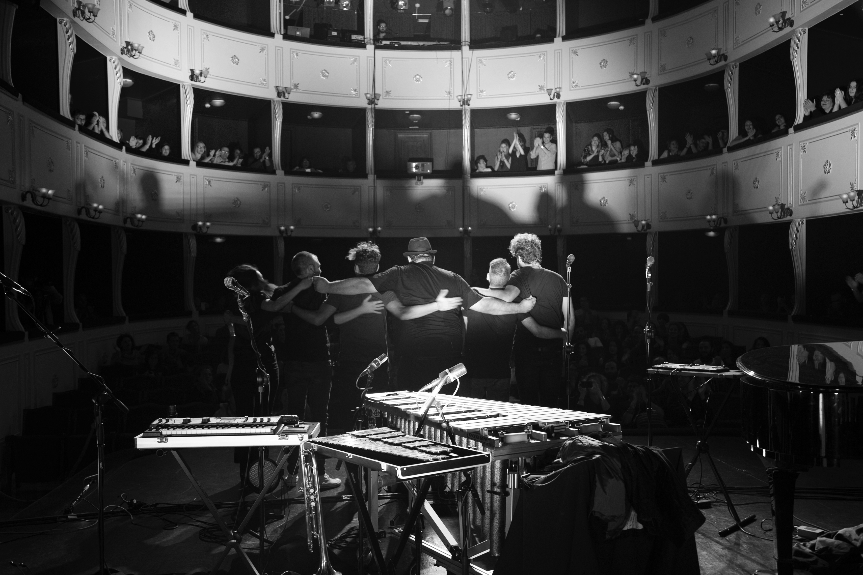 Γύρω στις εννιά παρά φτάνουμε στο υπέροχο θέατρο «Απόλλων», εκεί που σε λίγο θα αρχίσει η συναυλία του Theodore. Κόσμος ήδη περιμένει, κυρίως νέες ηλικίες αλλά όχι μόνο. Οι ντόπιοι έχουν μάθει, κάποιοι ξέρουν τι έχουν έρθει να ακούσουν, άλλοι έχουν τη καλή διάθεση να δουν κάτι διαφορετικό. Μπαίνοντας μέσα στην αίθουσα του θεάτρου χαζεύω τον μοναδικό ουρανό του. Όπως στις εκκλησίες δεσπόζει ο Παντοκράτωρ έτσι αντιστοίχως στο «Απόλλων» δεσπόζουν οι θεοί της μουσικής και της φιλοσοφίας. Καθώς οι τεχνικοί ετοιμάζουν τη σκηνή για το live, από την οροφή ο Mozart και ο Verdi παρακολουθούν το πλήθος των Συριανών, ανάμεσα τους και πολλά κορίτσια λυκείου με σέπτουμ δίπλα σε κομψές κυρίες με φροντισμένο μακιγιάζ και μαλλί.