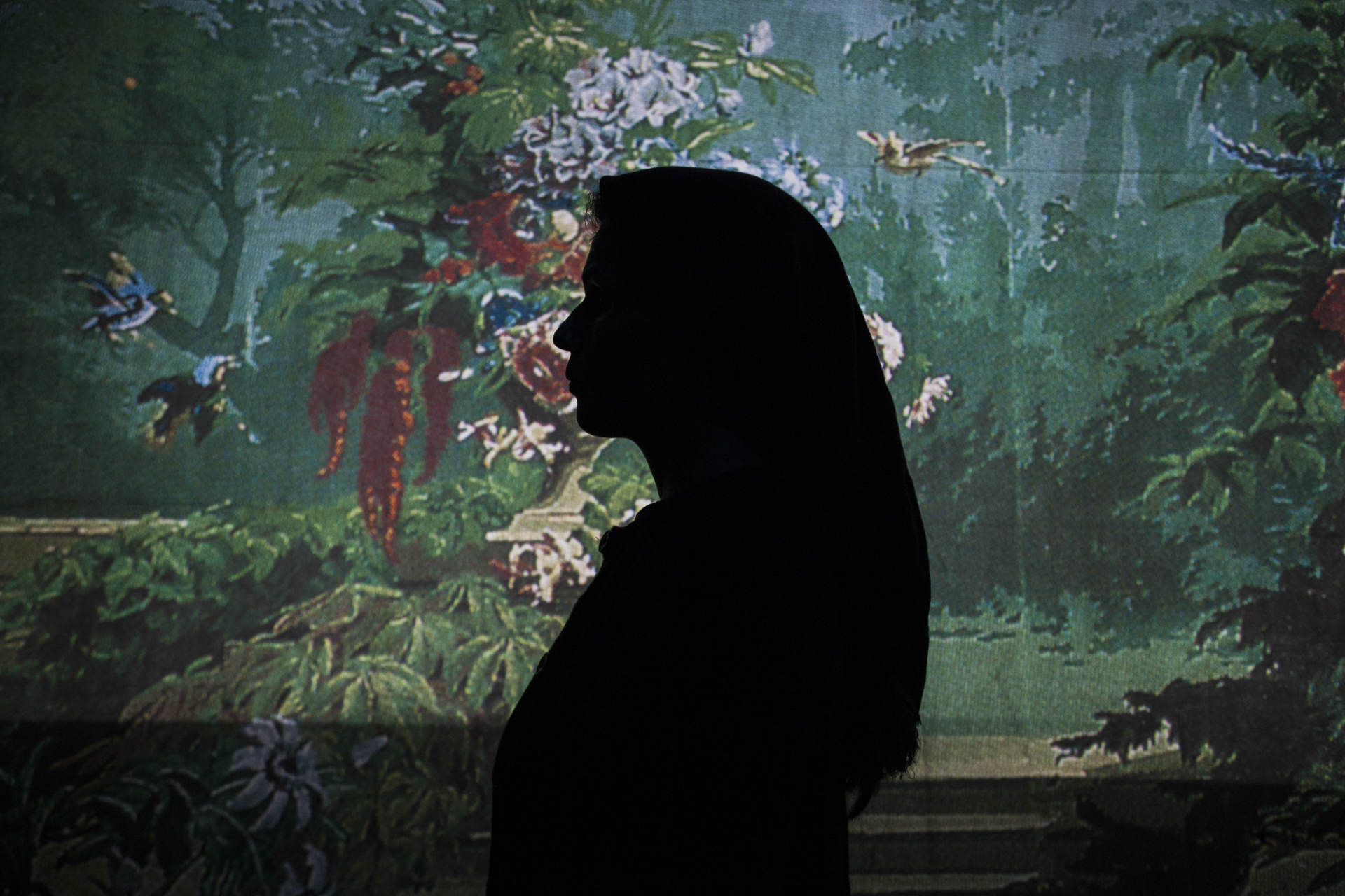 Η Ινές Ζήκου ποζάρει για το φακό του Ανδρέα Σιμόπουλου, μπροστά από το χρωματιστό πανό στα παρασκήνεια