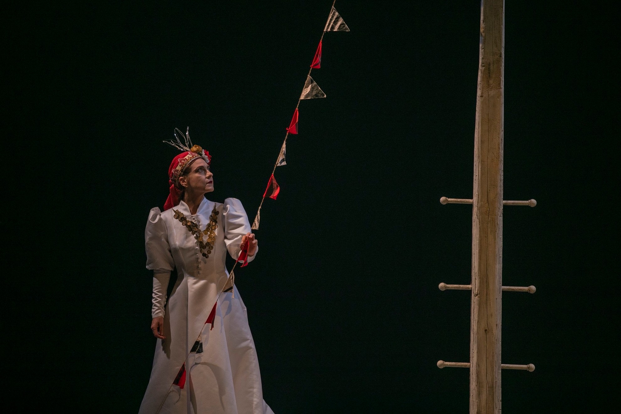 Διαβάζω ένα απόσπασμα από το δελτίο τύπου που συνοδεύει την παράσταση: «Στα ταραχώδη χρόνια της Ελληνικής Επανάστασης, μια παραγνωρισμένη ηρωίδα του Αγώνα συνομιλεί με τον εαυτό της, την εποχή της και το σύγχρονο κοινό. Το τραγούδι της κυρα-Δομνίτσας, αφηγείται με τον δικό του τρόπο –σε τέσσερις πράξεις με λόγο και μουσική– την ιστορία της Θρακιώτισσας καπετάνισσας και ηρωίδας της Ελληνικής Επανάστασης Δόμνας Βισβίζη. Το τραγούδι της κυρα-Δομνίτσας χρησιμοποιεί ως πρώτη ύλη ιστορικά τεκμήρια (αρχειακές καταγραφές, μαρτυρίες της εποχής, έγγραφα, ημερολόγια πλοίου, επιστολές), τα οποία και επεξεργάζεται με ποικίλο συγγραφικό τρόπο, από τον δημοτικό δεκαπεντασύλλαβο ως τη βιωματική γραφή, με σκοπό να αποδώσει την εξωτερική πραγματικότητα των γεγονότων και την εσωτερική ζωή των προσώπων. Την ιστορία της Δόμνας Βισβίζη, σε μορφή μονολόγου με χορικά στάσιμα, αποδίδει με ευαισθησία η ηθοποιός Σύρμω Κεκέ και συνθέτει, με τα μέσα του μουσικού θεάτρου, μια γυναικεία δημιουργική ομάδα που αποτελείται από τη δημοσιογράφο/συγγραφέα Μάρω Βασιλειάδου, τη συνθέτρια Μάρθα Μαυροειδή, που συνυφαίνει με γνώση παραδοσιακά και σύγχρονα ακούσματα, και τη σκηνοθέτρια Μαρία Μαγκανάρη. Συμμετέχει επταμελές μουσικό σύνολο και το γυναικείο φωνητικό σύνολο chórεs».