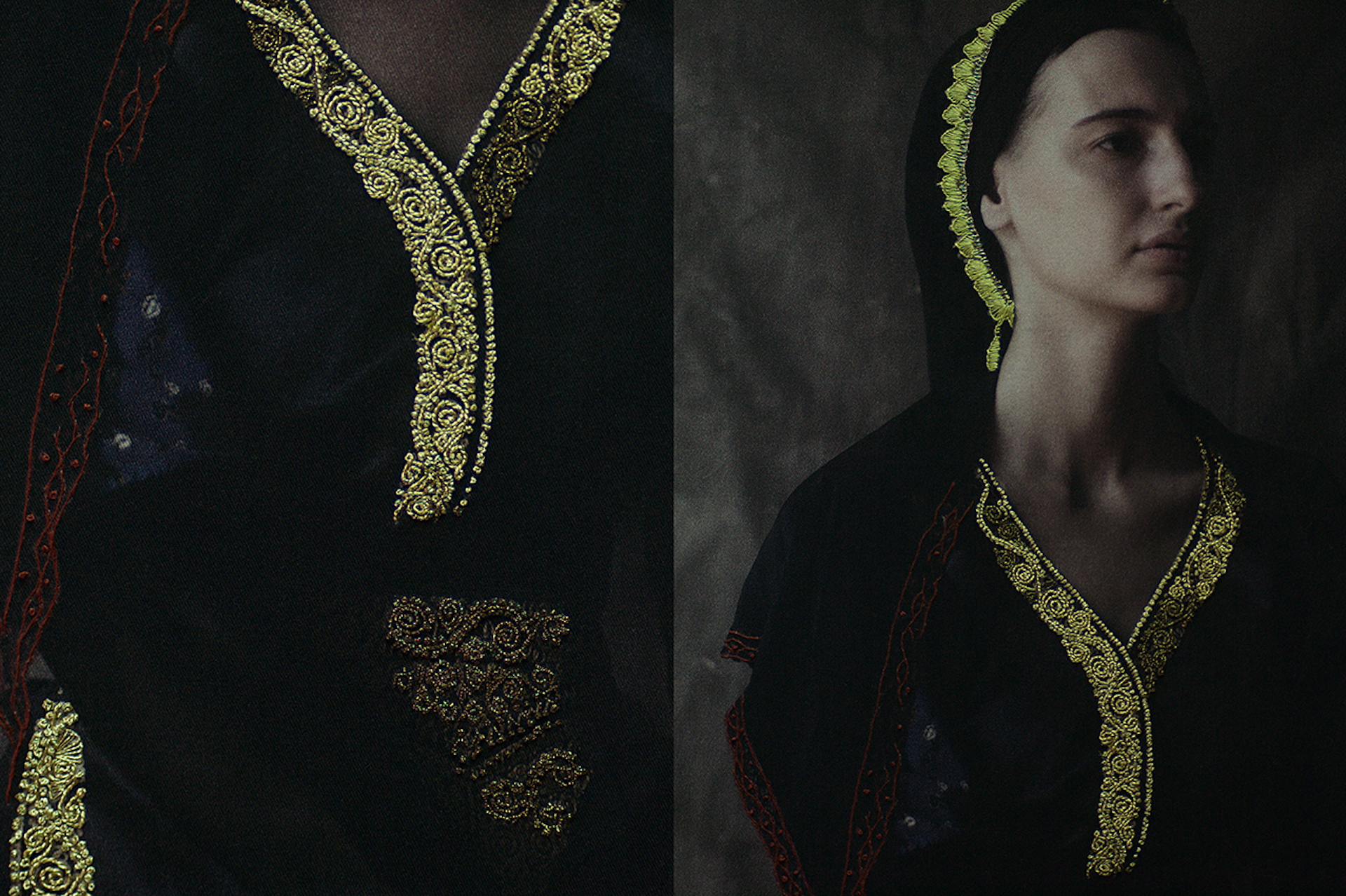 Αυτό είναι ένα μαντήλι που σύμφωνα με την Εβραϊκή παράδοση δεν πρέπει να ακουμπήσει ποτέ στη γη. Στυλιστικά με ενδιαφέρουν πολύ οι ενδυμασίες των απολυταρχικών καθεστώτων και των θρησκειών, οι στολές, θεωρώ ότι φέρουν μαζί τους μία αυστηρότητα και μία μεγάλη δύναμη, που μπορεί ακόμη και να ενισχύει τον φανατισμό υπέρ μίας θρησκείας ή ιδέας. Με το ίδιο μοντέλο έκανα, σε αντιπαραβολή, και έναν Παλαιστίνιο. Ενώ είναι το ίδιο πρόσωπο, το βλέμμα αυτής εδώ της εκδοχής του έχει τη δύναμη της επιβολής, ενώ του Παλαιστίνιου κουβαλάει έναν φόβο. Επέλεξα όμως μαζί με την «accidental curator» της έκθεσης, την Έρικα Βασιλείου, να μην εκθέσω τη δεύτερη εικόνα γιατί θα μπαίναμε σε ένα άλλο είδος διαλόγου που ξεφεύγει από το θέμα της έκθεσης…