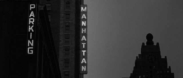 Μια φωτεινή πινακίδα που γράφει “Manhattan” αντί των χαρακτηριστικών τίτλων αρχής που έχουμε συνηθίσει στις ταινίες του σκηνοθέτη.