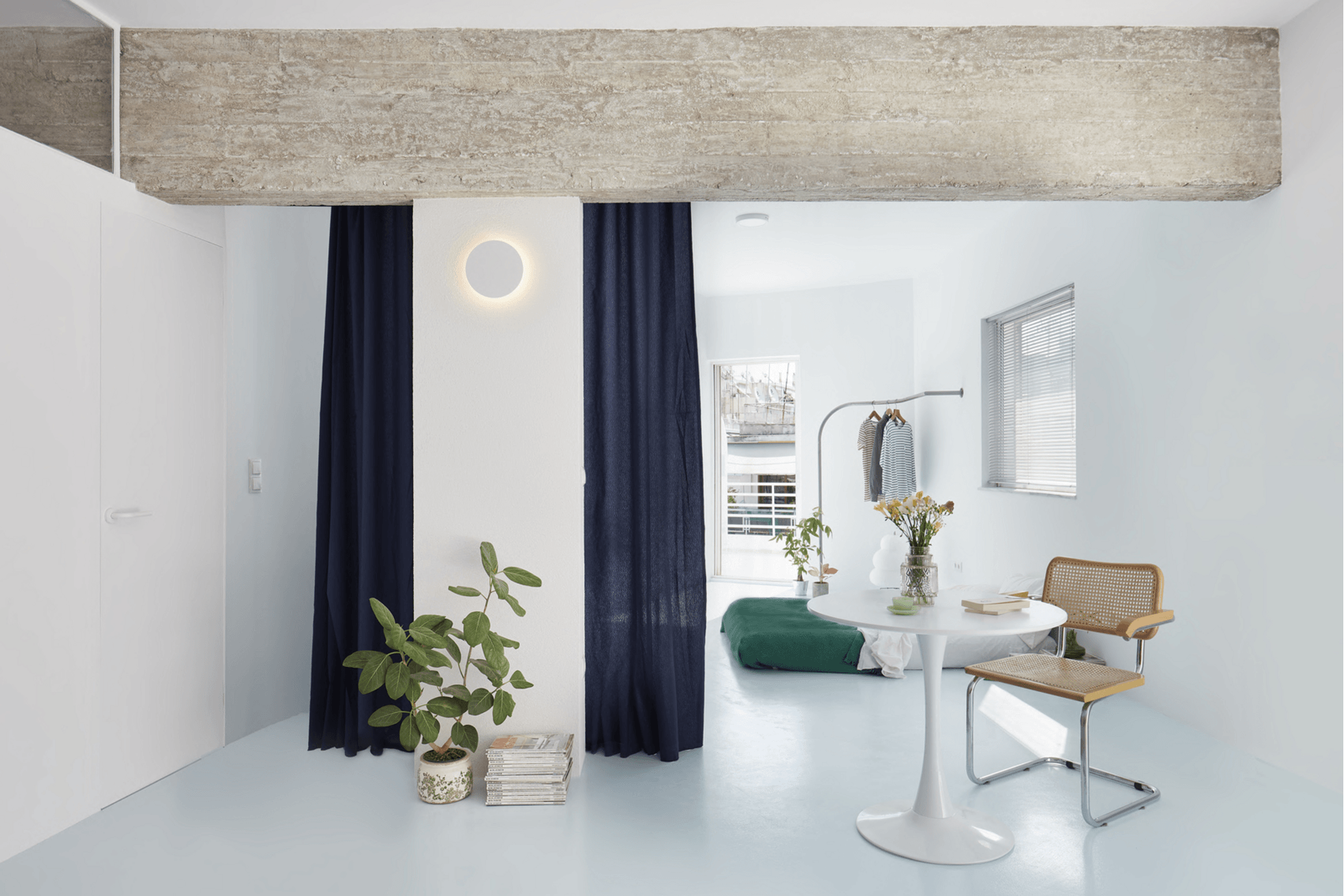 Με εργαλεία έναν καμπύλο λευκό τοίχο, σαν αγκαλιά, μια μπλε κουρτίνα ως κινητό όριο, μια γραμμική κόκκινη κουζίνα στον ρόλο…