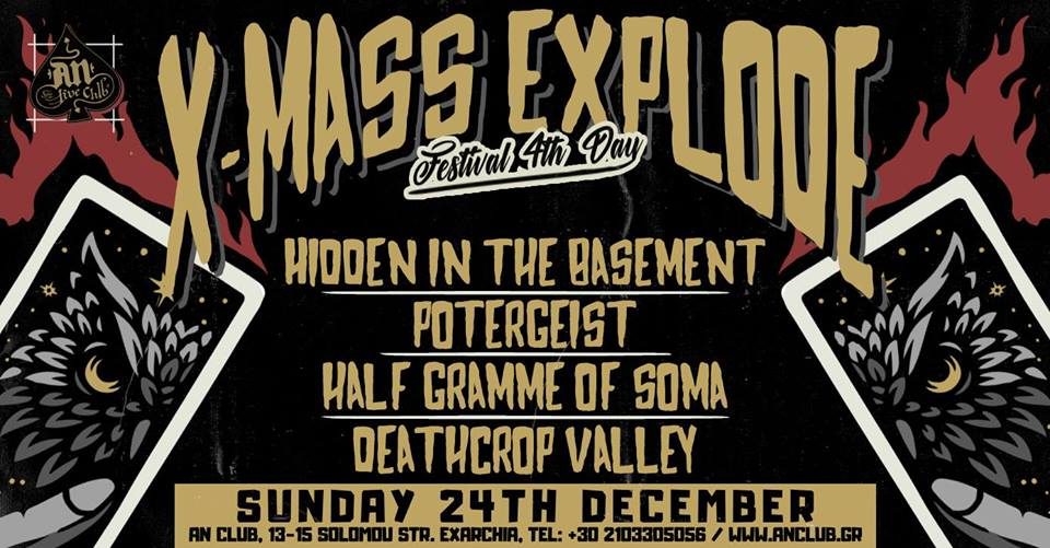 Το μεγαλύτερο Χριστουγεννιάτικο γεγονός, με μερικά από τα σημαντικότερα ονόματα της εγχώριας rock σκηνής, επιστρέφει και φέτος, αυτή την φορά, για ένα εκρηκτικό τετραήμερο, που θα αφήσει εποχή! Έτσι, η παραμονή των Χριστουγέννων και τελευταία μέρα του φεστιβάλ, είναι αφιερωμένη στον heavy – rock ήχο! Οι τέσσερις ογκόλιθοι Hidden In The Basement, Potergeist, Half Grame of Soma και Deathcrop Valley, υπόσχονται εκρηκτικές στιγμές, σε μια βραδιά απόλυτης rock γκρούβας!