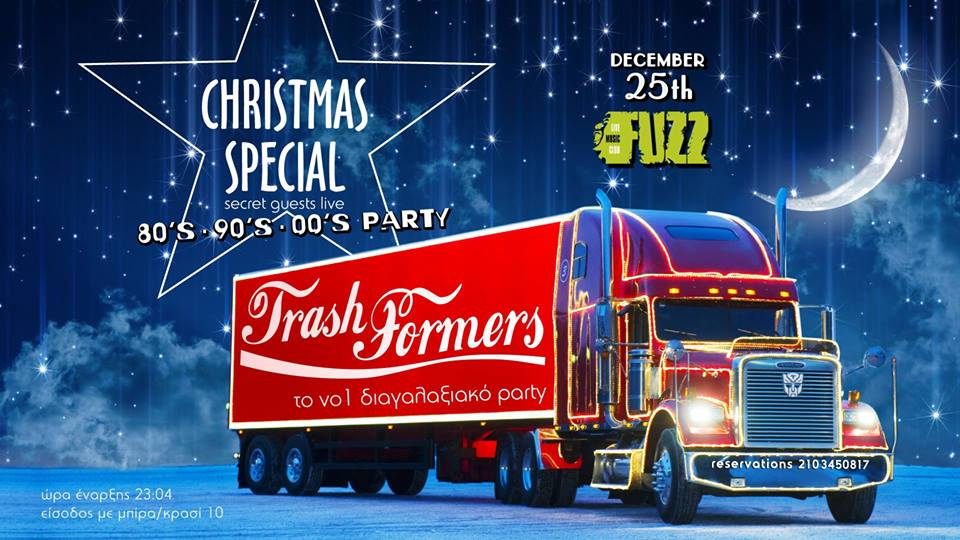 Ο αγαπημένος συναυλιακός χώρος του Fuzz, λατρεύει τα πάρτι. Εάν υπάρχει μία ομάδα στην αθηναϊκή νύχτα τα τελευταία 13 χρόνια, της οποίας η δράση είναι άρρηκτα συνδεδεμένη με την έννοια του άνευ ορίων πάρτι, αυτή ακούει στο όνομα Trashformers. 80’s, 90’s, 00’s ενώνουν τις δυνάμεις τους και η καλύτερη trash, ελληνική (και όχι μόνο) μουσική, παιγμένη από τους DJs της ομάδας και πλαισιωμένη από ένα απολαυστικό και κωμικό «μπαλέτο», υπόσχεται πως θα κάνει και αυτά τα Χριστούγεννα αξέχαστα.