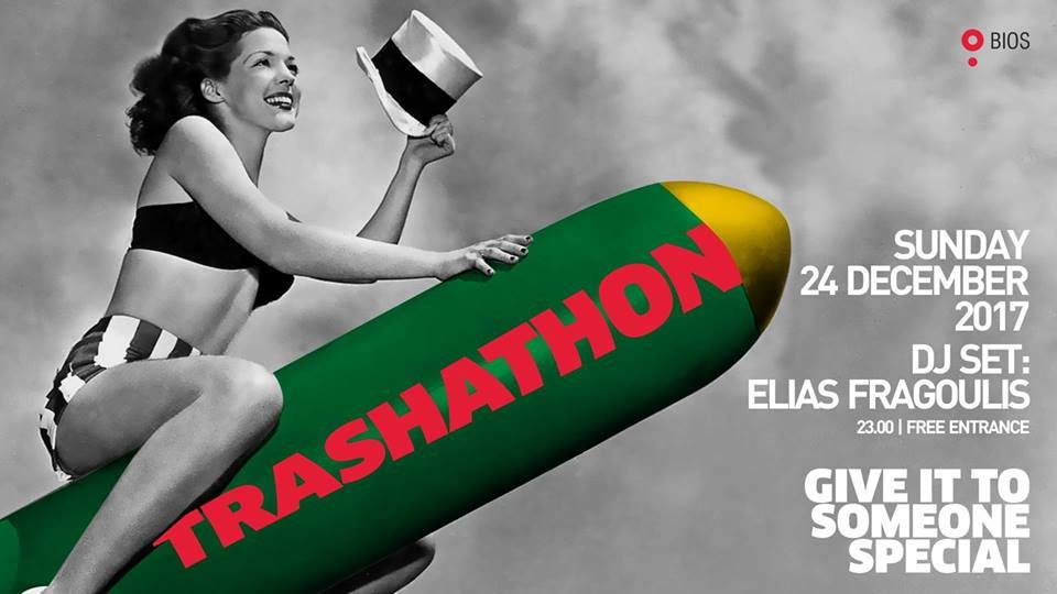 Για έκτη συνεχόμενη χρονιά, το διαβόητο Trashathon επιστρέφει στο BIOS exploring urban culture, όπως κάθε έγκλημα που σέβεται τον εαυτό του. To αγαπημένο πάρτι χαράς και κακού γούστου, με DJ τον Ηλία Φραγκούλη να ανασύρει από το παγκόσμιο ρεπερτόριο τραγούδια που ο πολιτισμός και η ανθρωπότητα όλη θα ήθελαν να ξεχάσουν.