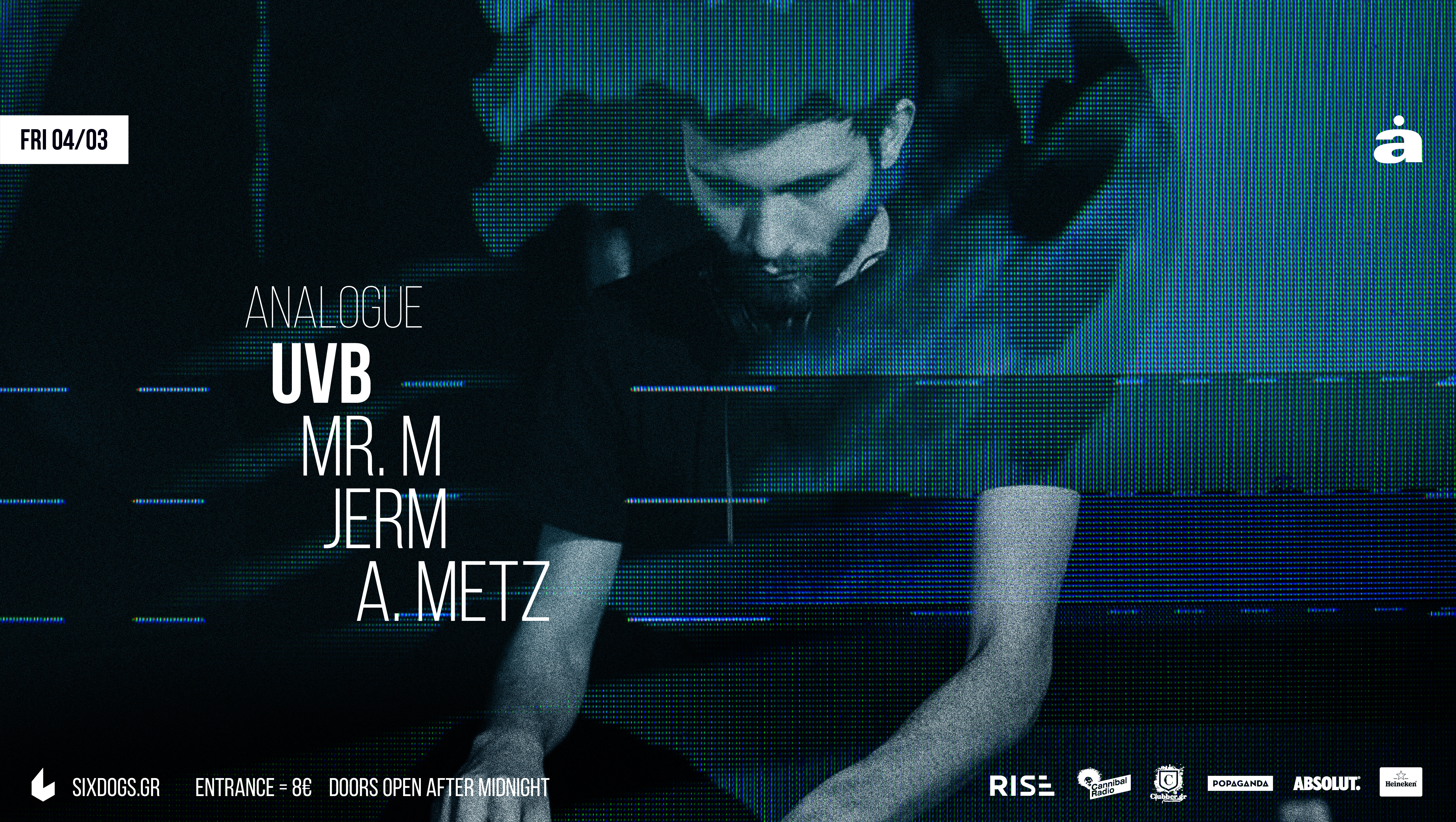 Την Παρασκευή 4 Mαρτίου, η Analogue παρουσιάζει τον πολυτάλαντο Γάλλο Dj και παραγωγό UVB, στο πλαίσιο της περιοδείας του για την προώθηση του album του “Life”. UVB είναι το ψευδώνυμο του Γάλλου Sébastien Michel. Mε έμφυτο το πάθος για τη μουσική, εστίασε την προσοχή του στην ηλεκτρονική μουσική από το 2009, όταν και πρωτοξεκίνησε τις παραγωγές. Παράλληλα, άρχισε να πειραματίζεται με διάφορα στυλ μουσικής με τον συνεργάτη του στο στούντιο Jean Redondo, υπό την ονομασία «Daxyl», έχοντας σαν αποτέλεσμα να διαμορφώσει το ωμό και σκληρό μουσικό του ύφος. Από το 2013 άρχισε να επικεντρώνεται στο δικό του techno project, live set με άλλα λόγια, που αποτελούνταν αποκλειστικά από δικές του παραγωγές και τα οποία παρουσίαζε σε μεγάλα club στο Βερολίνο (Urban Spree, Tresor). Το 2014, κυκλοφόρησε το πρώτο του EP, ”What I’ve Learned” στην Mord, το οποίο διαδέχθηκε το διπλό ΕP, ”Second Life”. Το 2015 σηματοδότησε μια σημαντική στροφή για αυτόν ως DJ και παραγωγό. Αποφάσισε να αφιερωθεί πλήρως στην παραγωγή και στο DJing και ξεκίνησε περιοδείες σε Ευρώπη, Ασία και Νότια Αμερική, παίζοντας στα καλύτερα techno clubs. Ως παραγωγός κυκλοφόρησε ένα ακόμα EP στην Fracture, το οποίο σύντομα ακολούθησε το πρώτο του LP ”Life” στη Mord στο τέλος του έτους. Την περίοδο αυτή ο UVB ετοιμάζει νέα μουσική στο πλαίσιο προετοιμασίας για την έναρξη της δικής του δισκογραφικής “Body Theory”, ενώ παράλληλα μέσα από τα πολυπληθή πλέον Dj gigs του ανά τον κόσμο, προωθεί τη δικιά του οπτική για την Techno. Μαζί του στα decks του six d.o.g.s οι ιδιοκτήτες και residents της Analogue, Α.metz, Jerm & Mr.M.