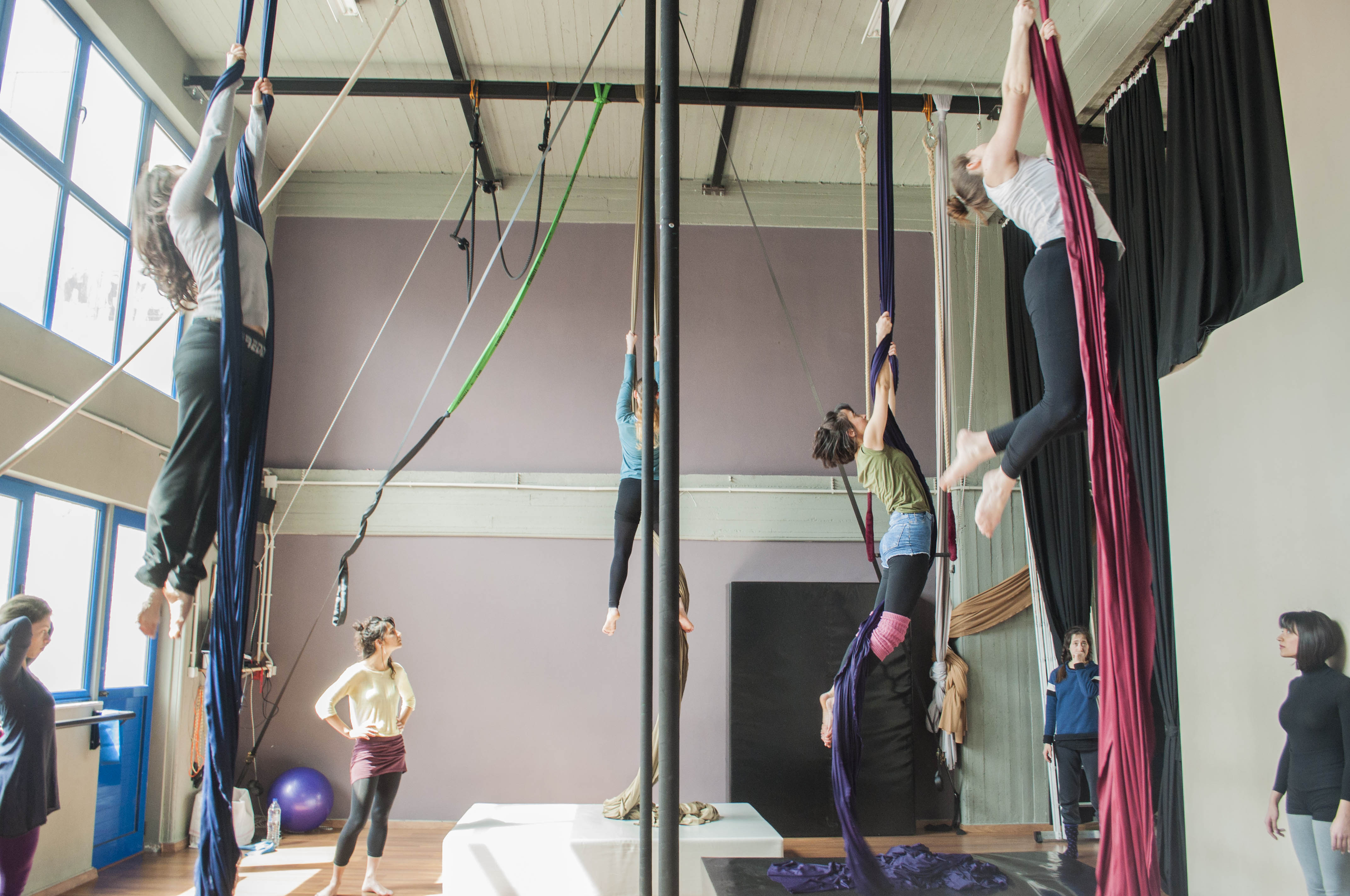 Ο αθλητής στα εναέρια καλείται να σκαρφαλώσει πάνω σε εξοπλισμούς που κρέμονται από κάποιο ψηλό σημείο, με ασφαλή και συγκεκριμένο τρόπο, με σκοπό να γυμναστεί ή να κάνει τρελές πτώσεις και χορογραφίες. «Μετά την προπόνηση στα πανιά, χωριζόμαστε στους εξοπλισμούς και δουλεύουμε ενδυνάμωση, τεχνική και ποζεριές. Τέλος κάνουμε αποθεραπεία. Εδώ μπορείς να εξασκηθείς στην ευλυγισία, ενώ το μπαλέτο ενηλίκων και ο σύγχρονος χορός είναι μερικά από τα βασικά μαθήματα».