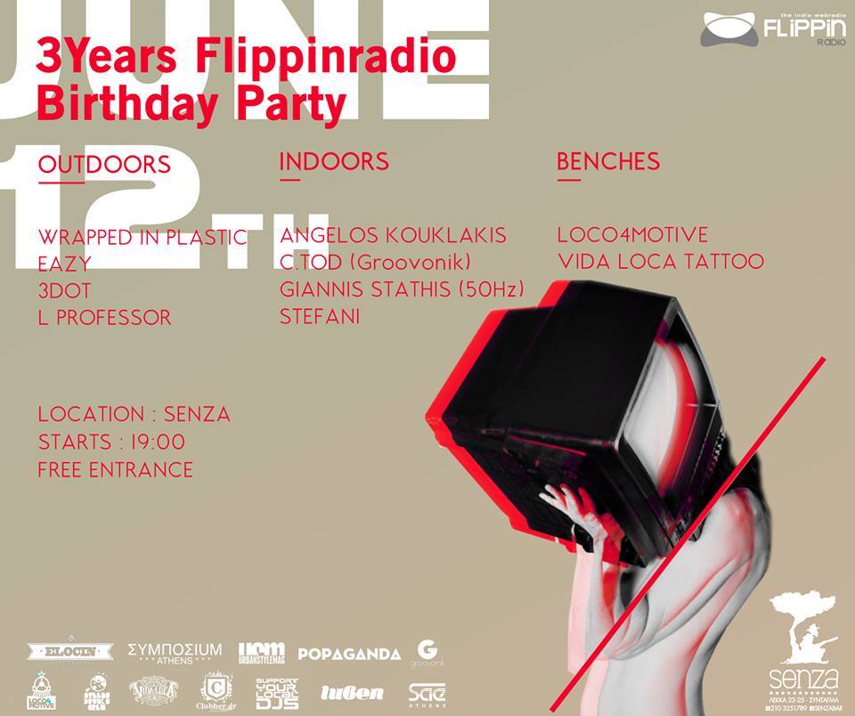 Ο Flippinradio συμπλήρωσε 3 χρόνια λειτουργίας και το γιορτάζει με ένα μεγάλο party στο Senza την Πέμπτη 12 Ιουνίου. Οι μουσικές θα ξεκινήσουν από τις 19:00 το απόγευμα στη Στοά της οδού Λέκκα, ενώ μετά τα μεσάνυχτα το party θα φιλοξενηθεί στο χώρο του Senza.