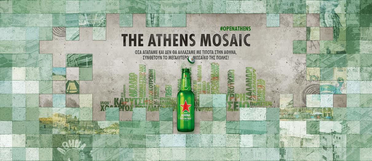 Γιορτάζοντας την καμπάνια «Cities»για δεύτερη συνεχόμενη χρονιά, η Heineken αφιερώνει τον Οκτώβριο στην Αθήνα και μας καλεί να δημιουργήσουμε ένα μωσαϊκό, φτιαγμένο από ψηφίδες με μηνύματα για την Αθήνα από τους ίδιους τους Αθηναίους που τη ζουν και τη διαμορφώνουν καθημερινά. Πώς; Απαντάμε στο ερώτημα «Τι δεν θα άλλαζες με τίποτα στην Αθήνα;» στο Heineken.gr. Κάθε ιδέα θα αποτυπωθεί σε μια ψηφίδα και θα αποτελέσει κομμάτι ενός μεγάλου, «ζωντανού»Μωσαϊκού. Στόχος της μάρκας είναι η αποτύπωση σκέψεων, εμπειριών, όμορφων μυστικών και ιδεών των πολιτών που δίνουν χαρακτήρα στην πόλη σε ένα έργο που θα αποτελεί μια εικαστική πινελιά στο κέντρο της πόλης. Η αποκάλυψη του Μωσαϊκού της Αθήνας θα γίνει με ένα μεγάλο event που θα αντιπροσωπεύει όλα αυτά που την κάνουν μοναδική.