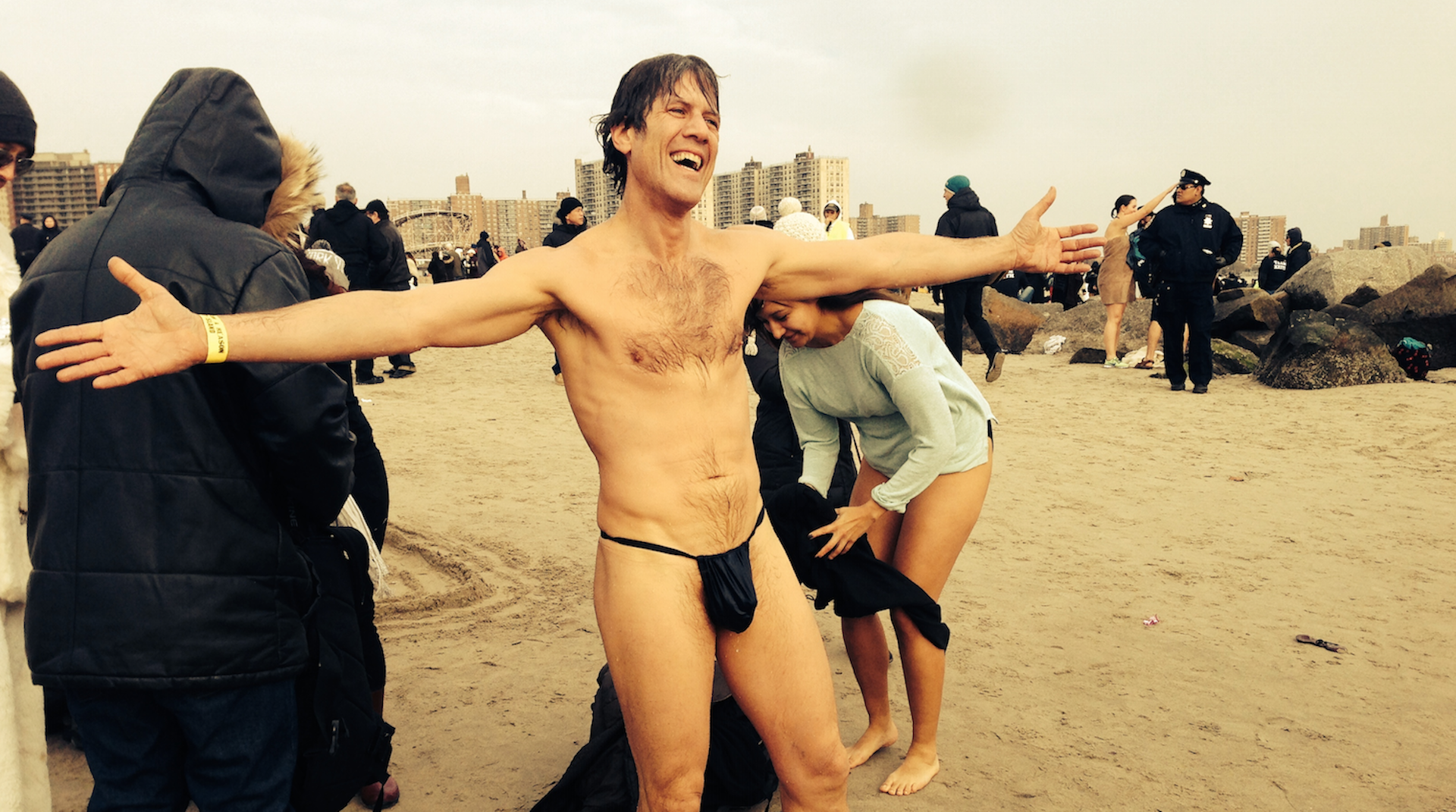 Μια παρέα (με “αρχηγό” έναν τύπο ντυμένο γορίλα) από μια οργάνωση διαδήλωνε υπέρ της δημιουργίας δημόσιων κήπων στο Coney Island κρατώντας μπρόκολα στα χέρια και φωνάζοντας συνθήματα για τον νέο Δήμαρχο της Νέας Υόρκης, τον Bill de Blasio. Παππούδες χίπηδες ξεχασμένοι στο καλοκαίρι της αγάπης, φορώντας πολύχρωμα κολάν έκαναν πιρουέτες στην άμμο, ένας τύπος με ένα “κολασμένο” στρινγκ έγινε το επίκεντρο της προσοχής όταν βγήκε από τη θάλασσα, hipsters έκανα επίδειξη των trendy μαγιό τους, μια ευτραφής κυρία τα πέταξε όλα για να φορέσει τα ζεστά της ρούχα, ένα ειδικό για την άμμο τζιπάκι της Αστυνομίας της Νέας Υόρκης (NYPD) έκοβε βόλτες και η οργανωτική επιτροπή μοίραζε καρτολίνες “I did it” στου τολμηρούς (sic) που έπεφταν στο νερό.