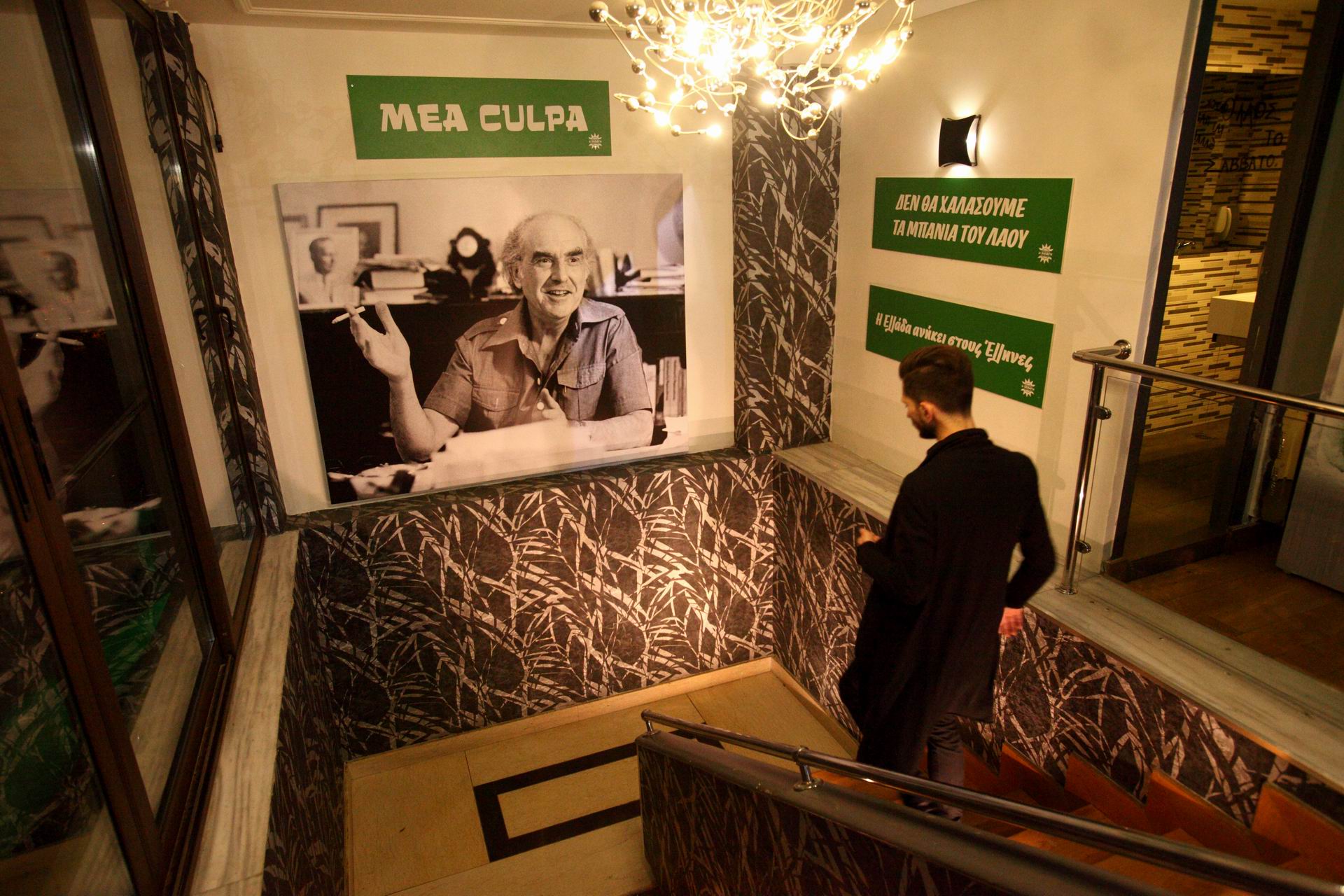 Όπως αναμενόταν το πράσινο κυριαρχεί στον χώρο, ίσως λίγο παραπάνω απ’ ότι θα έπρεπε. Το ΠΑΣΟΚ όμως πάντα χαρακτηριζόταν από πληθωρικότητα και υπερβολή. Οι πράσινες ψάθινες καρέκλες καφενείου είναι εκεί για να υποστηρίξουν το κόνσεπτ, μόνο που είναι του κουτιού χωρίς την πατίνα των γνήσιων που φιλοξενούσαν βετεράνους του ΕΑΜ-ΕΛΑΣ, ανακουφισμένους που επιτέλους αναγνωρίστηκε η αντίστασή τους. Εκεί είναι και τα συνθήματα του πρώιμου ΠΑΣΟΚ, για τις «βάσεις του θανάτου» και την ΕΟΚ που τα ατενίζουν με πικρό χαμόγελο οι επίγονοι του κινήματος αναλογιζόμενοι τον βολονταρισμό της νιότης τους. Η μόδα των παλιών εφημερίδων ως σουβέρ δε θα μπορούσε να λείπει από ένα ρετρολάγνο μαγαζί, πανηγυρικά πρωτοσέλιδα του «δημοκρατικού» χώρου από την επομένη των εκλογών του ‘81. Υπάρχουν κι ελάχιστα της Δεξιάς με μαύρες πλερέζες και το, καλύτερο όλων, αφελώς αισιόδοξο του Ριζοσπάστη θυμίζοντας την υπόσχεση του Αντρέα ότι θα πάρει τηλέφωνο τον Χαρίλαο για να φτιάξουν μαζί κυβέρνηση. Σκόρπιες αφίσες, κυρίως από τις εκλογές του ‘85, για να θυμούνται οι παλιότεροι και να μαθαίνουν οι νεότεροι τα επιτεύγματα της πρώτης, ορθόδοξης, τετραετίας. Τις ελάχιστες μεγάλες επιφάνειες του χώρου καταλαμβάνουν αφίσες του Ηγέτη (όχι τυχαία τα εγκαίνια γίνονται ανήμερα της ονομαστικής του εορτής), γιατί σοσιαλισμός και προσωπολατρεία πάνε μαζί.