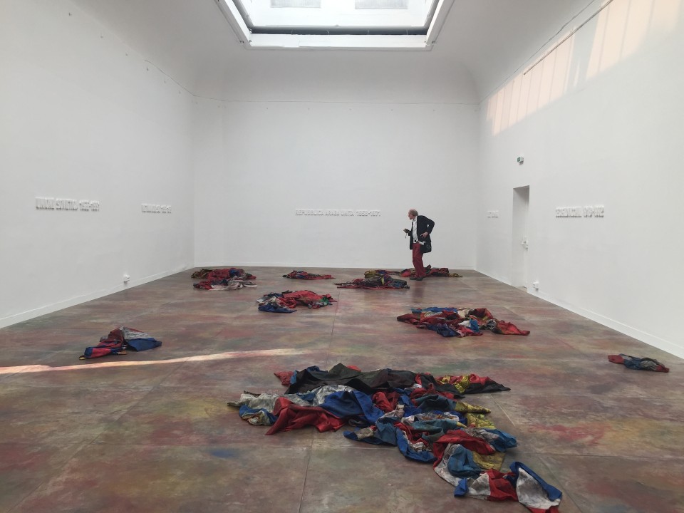 Το πολύ δυνατό έργο του Ivan Grubanov με τίτλο United Dead Nations στο περίπτερο της Σερβίας. Στο πάτωμα σημαίες από χώρες που δεν υπάρχουν πια.