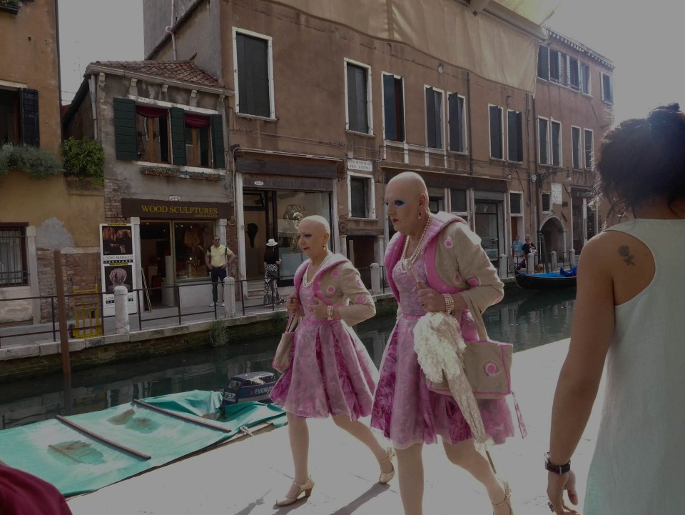 Το περίφημο καλλιτεχνικό ντουέτο EVA & ADELE που κυκλοφορεί πάντα ντυμένο το ίδιο (και με ξυρισμένο το κεφάλι) έκανε και αυτό το tour από μουσείο σε μουσείο. Εδώ λίγο πριν το μουσείο Peggy Guggenheim Collection.