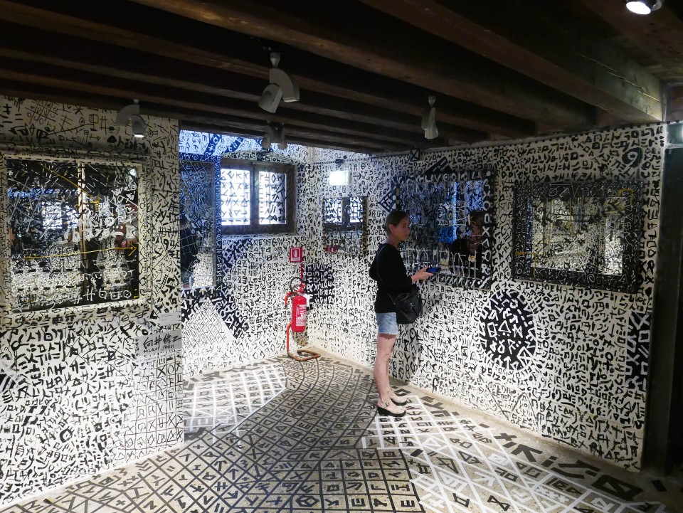 Στην καταπληκτική έκθεση The Sound of Creation με έργα των Beezy Bailey και Brian Eno στο Palazzo Pisani. Η φωτογραφία είναι από τον τελευταίο όροφο του κτιρίου. Αυτό που δεν φαίνεται καθαρά είναι ότι από το μικρό παραθυράκι έχεις θέα αφ υψηλού όλης της Βενετίας.