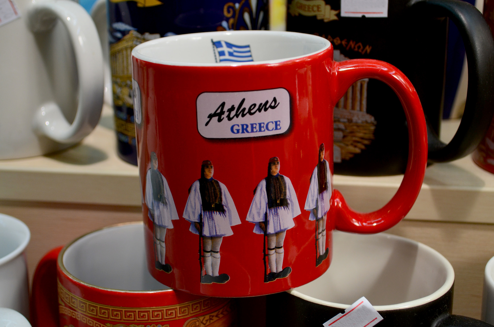 Οι ανέκφραστοι προστάτες του άγνωστου στρατιώτη- που δέχονται συνεχώς ενοχλήσεις από περαστικούς προκειμένου να κάνουν έστω και ένα μικρό μορφασμό -oι αγαπημένοι των τουριστών και των περιστεριών, εύζωνες, τώρα και σε κούπα. Παραταγμένοι σε κατακόκκινο φόντο, με την χαρακτηριστική στολή και το όπλο τους στο χέρι, είναι άξιο απορίας γιατί η παράσταση αυτή να κοσμεί μια κούπα γαλλικού καφέ, αντί ένα φλυτζανάκι ελληνικού.