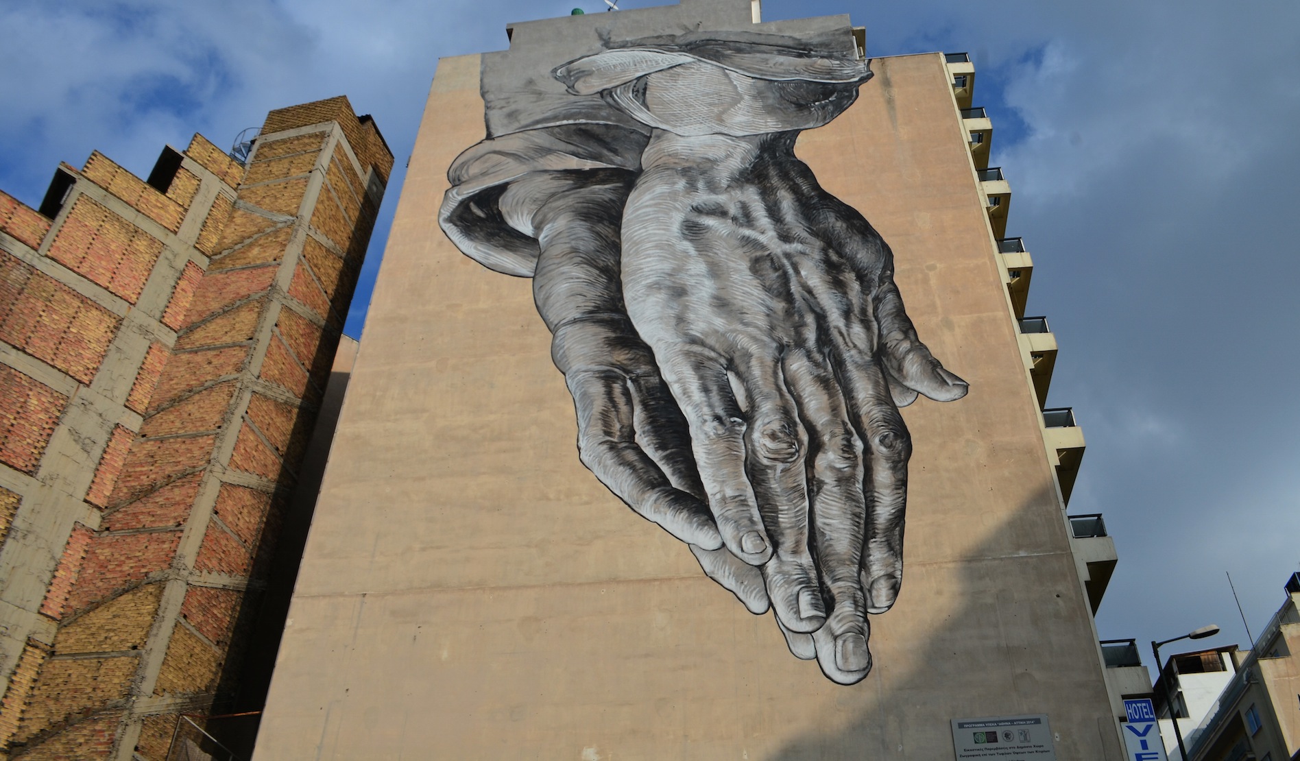 Εμπνευσμένο από το έργο του Albrecht Dürer αποτελείται από τα επιβλητικά ενωμένα χέρια που προσεύχονται πάνω από τα σταθμευμένα αμάξια στην οδό Πειραιώς 20, δίπλα από το ξενοδοχείο Vienna. Φιλοτεχνήθηκε από τον Παύλο Τσάκωνα στο πλαίσιο της συνεργασίας του ΥΠΕΚΑ και της ΑΣΚΤ για το πρόγραμμα «Τέχνη και Δημόσιος χώρος, Ζωγραφική επί τυφλών όψεων κτιρίων της Αθήνας», χρειάστηκε 25 μέρες για να ολοκληρωθεί το καλοκαίρι του 2011 και από τότε καθηλώνει όσους υψώνουν το βλέμμα ανεβαίνοντας προς την πλατεία Ομονοίας.
