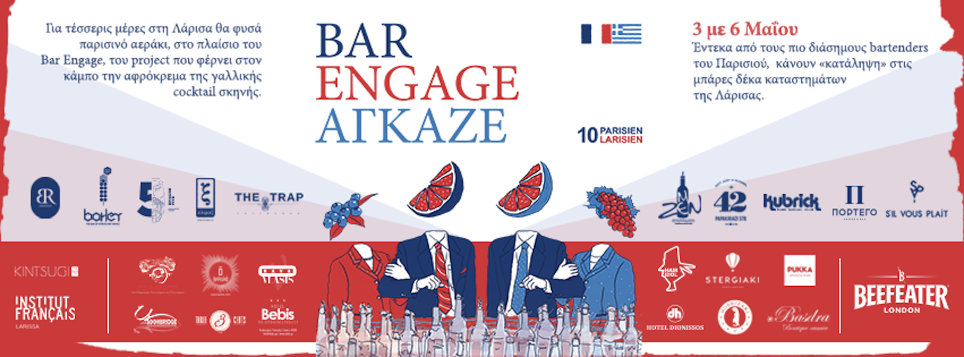 Για τέσσερις μέρες στη Λάρισα θα φυσά παρισινό αεράκι, στο πλαίσιο του Bar Engage, του project που φέρνει στο θεσσαλικό κάμπο την αφρόκρεμα της γαλλικής cocktail σκηνής. Από τις 3 έως τις 6 Μαΐου, 11 από τους πιο διάσημους bartenders του Παρισιού, θα κάνουν «κατάληψη» στις μπάρες 10 μαγαζιών της θεσσαλικής πρωτεύουσας. Μέσα από την κινηµατογράφηση της επίσκεψης το κοινό θα γνωρίσει και θα ακολουθήσει σε µια ενδιαφέρουσα γευστική και ιστορική αναζήτηση τον Sullivan Doh του «Le Syndicat», που φιγουράρει στη λίστα 30under30 του περιοδικού Forbes, τον Mido Ahmed Yahi από το «Café Moderne», γνωστό από την εµφάνισή του στην εκποµπή του Jamie Oliver και τον Remy Savage του «Little Red Door», που συγκαταλέγεται στα 50 καλύτερα bars του κόσµου και ο ίδιος στους πιο ευρηµατικούς bartender των τελευταίων ετών.