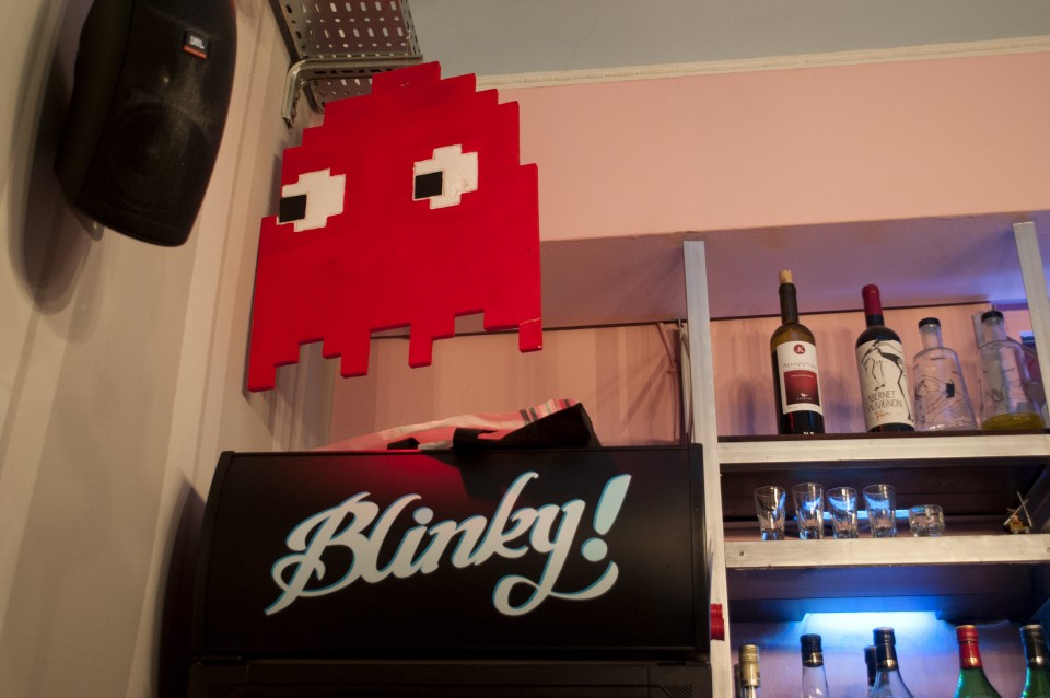 Ο Blinky είναι το κόκκινο φαντασματάκι του Pac – Man, το πιο θυμωμένο από όλα, που δεν αφήνει σε ησυχία το κίτρινο smiley που προσπαθεί να επιβιώσει στον λαβύρινθο με τις μπλε κουκκίδες. Το urban dictionary από την άλλη, δίνει σαν ορισμό της λέξης το εξής: “If you someone know who is cool, funny, and an all around good person, their name can be substituted for the word “Blinky““. Αυτά τα ετερόκλιτα facts μετουσιώθηκαν σε ένα παιχνιδιάρικο μπαρ, το Blinky, σκαρφαλωμένο στο μικρό ανηφορικό στενό της οδού Αθανασίας στο Παγκράτι.