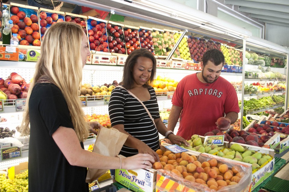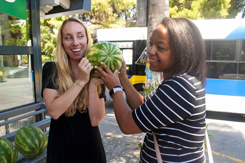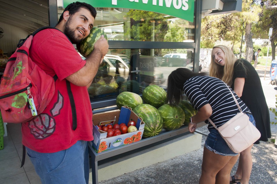 Κατεβαίνοντας προς την κάτω πλατεία τα κορίτσια σταματούν σε ένα μανάβικο επί της Αγίου Ιωάννου. Να και κάτι καινούριο για αυτές καθώς ο Άλεξ τις μαθαίνει πώς χτυπάμε το καρπούζι για να δούμε εάν είναι καλό ή όχι. Σκληρή κατάδυση στην κουλτούρα της αθηναϊκής καθημερινότητας. Τα κορίτσια γελούν προσπαθώντας να βγάλουν άκρη, ο κύριος που έχει το μαγαζί μας κοιτά χαμογελώντας, είναι συνηθισμένος σε αυτό το θέαμα καθώς καθημερινά περνούν από εκεί οι international students για να αγοράσουν τα, εξωτικά ή και όχι, γι’ αυτούς φρούτα.