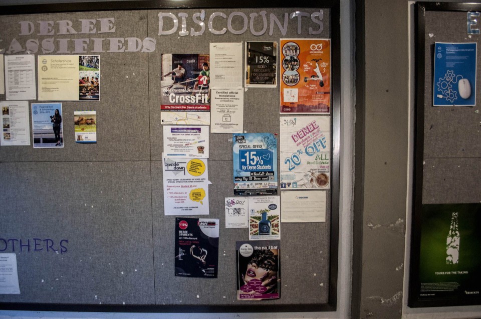 H Ξένια Κούκιτς που κατάγεται από τη Σερβία, αλλά ζει 16 χρόνια στην Ελλάδα, σπουδάζει Επικοινωνία στο Deree και παράλληλα επωφελείται του προγράμματος Work Study και εργάζεται στο γραφείο Student Affairs, καλύπτοντας έτσι ένα σημαντικό μέρος των εξόδων της. «Εδώ δουλεύω τρεις ώρες την ημέρα αλλά περνάω όλο τον χρόνο μου στο Deree, από το πρωί μέχρι το βράδυ. Έχει τόσα πολλά πράγματα να κάνεις που δε βαριέσαι ποτέ. Εγώ για παράδειγμα παίζω στη γυναικεία ομάδα ποδοσφαίρου». Καθώς μας ξεναγεί στο campus περνάμε μπροστά από έναν μεγάλο πίνακα που είναι καρφιτσωμένα φυλλάδια από τα μαγαζιά της περιοχής –από καφετέριες μέχρι κομμωτήρια- που αναγράφουν πάνω την έκπτωση που προσφέρουν στους σπουδαστές του Κολλεγίου.