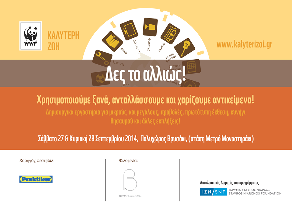 Πόσα από τα αντικείμενα που χρησιμοποιείς καθημερινά έχεις βαρεθεί/αποσύρει/ξεχάσει ότι υπάρχουν; Το πρόγραμμα Καλύτερη Ζωή της WWF Ελλάς, καλεί μικρούς και μεγάλους να μεταποιήσουν, να αναδημιουργήσουν, να κατασκευάσουν μόνοι τους αντικείμενα καθημερινής χρήσης, σε ένα διήμερο φεστιβάλ στον πολυχώρο Βρυσάκι, το τελευταίο Σαββατοκύριακο του Σεπτεμβρίου.