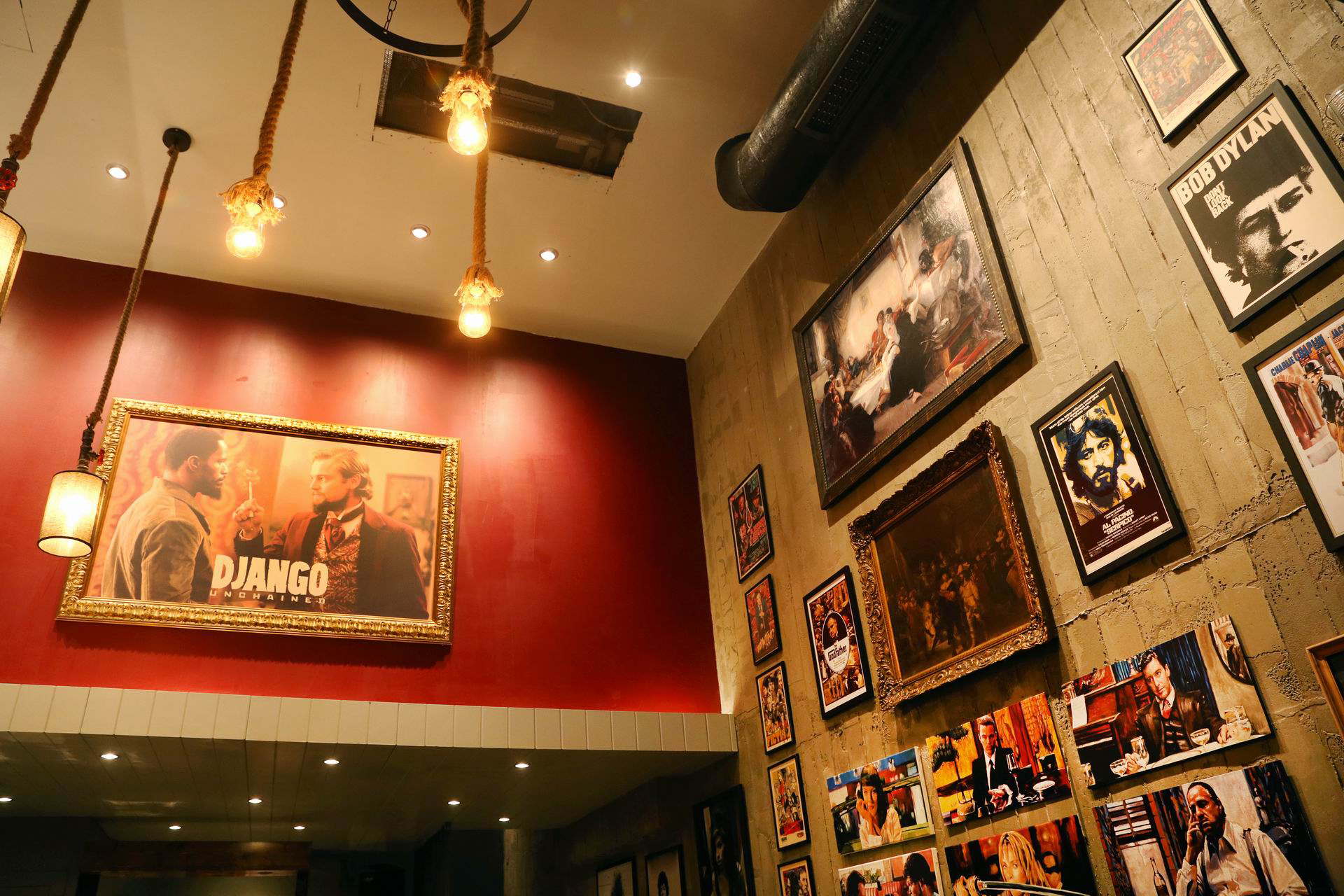 Αυτό όμως δεν είναι το μόνο που θα παρατηρήσει κανείς στο Django. Για την ακρίβεια, μπαίνοντας μέσα το μάτι σας θα πέσει αμέσως στην κεντρική αφίσα από την ομώνυμη ταινία με τον Τζέιμι Φοξ και τον Λεονάρντο ντι Κάπριο. Ο Ταραντίνο είναι η μεγάλη σκηνοθετική αγάπη του ιδιοκτήτη. Στο χώρο θα βρείτε παντού κι άλλους πίνακες με στιγμιότυπα από ταινίες του σκηνοθέτη και όχι μόνο: υψώνοντας το βλέμμα σας πάνω από την κάβα θα δείτε το θρυλικό “Rat Pack” (όπως δηλαδή έμεινε να λέγεται η «άσωτη» τετράδα των Φρανκ Σινάτρα, Ντιν Μάρτιν, Σάμμυ Ντέιβις Τζρ. και Πίτερ Λόφορντ) να δοκιμάζει την τύχη του στο μπιλιάρδο.