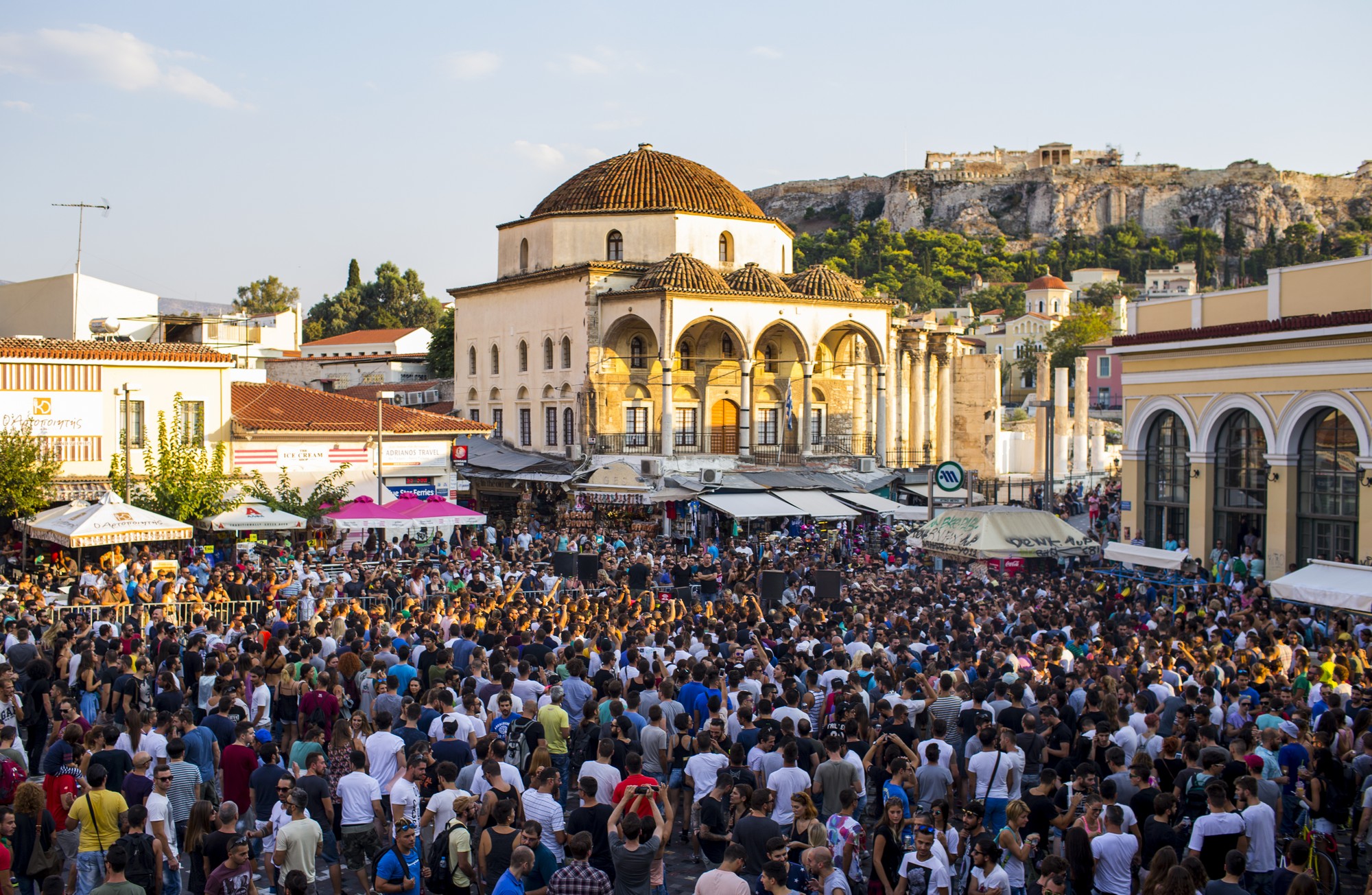 Μια τέτοια φρέσκια ιδέα, που φέρνει στο μυαλό τα αυθόρμητα dance πάρτι του παρελθόντος, είναι και τα #dotup events που διοργανώνει τα τελευταία χρόνια σε κεντρικές πλατείες ή αγορές των πόλεων ανά τον κόσμο o Richie Hawtin με το Red Bull Music Academy. Και για να έχετε μια αίσθηση μεγέθους, τα #dotup είναι, τηρουμένων των αναλογιών πάντα, σα να δίνει συναυλία χωρίς είσοδο ο Dave Gahan (αν έλεγα οι Depeche Mode θα ήταν υπερβολή). Έτσι λοιπόν, το Σάββατο στις 18:00 μαζεύτηκε πολύς κόσμος να ακούσει τον Hawtin, είτε για ζέσταμα πριν το μεγάλο πάρτι που θα ακολουθούσε το βράδυ στο Gazi Music Hall, είτε γιατί έχει πλέον παιδιά και που να τραβιέται στα κλαμπ με τους ιδρωμένους πιτσιρικάδες, είτε γιατί δεν έχει ξεχάσει ακόμα εκείνο το αξέχαστο βράδυ στο U-Matic πριν καμιά ντουζίνα χρόνια ή γιατί απλώς έκανε τη σαββατιάτικη βόλτα του στο κέντρο της πόλης και δεν είχε ιδέα ποιος είναι αυτός ο ξανθός τύπος με τη φράντζα που είναι σκυμμένος, πραγματικά χωρίς να παίρνει ανάσα, πάνω απ’τα decks.