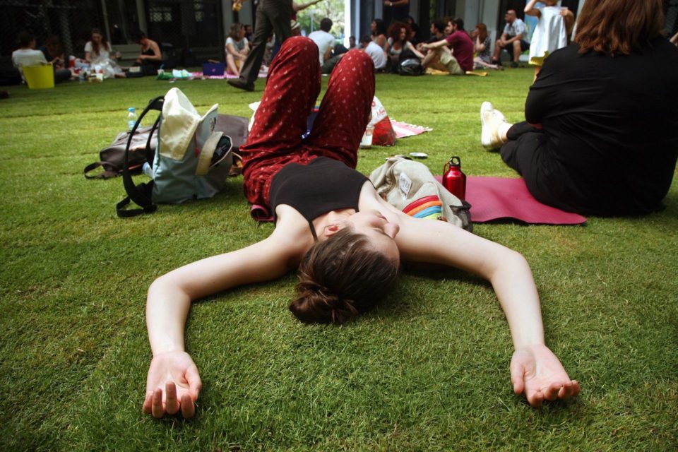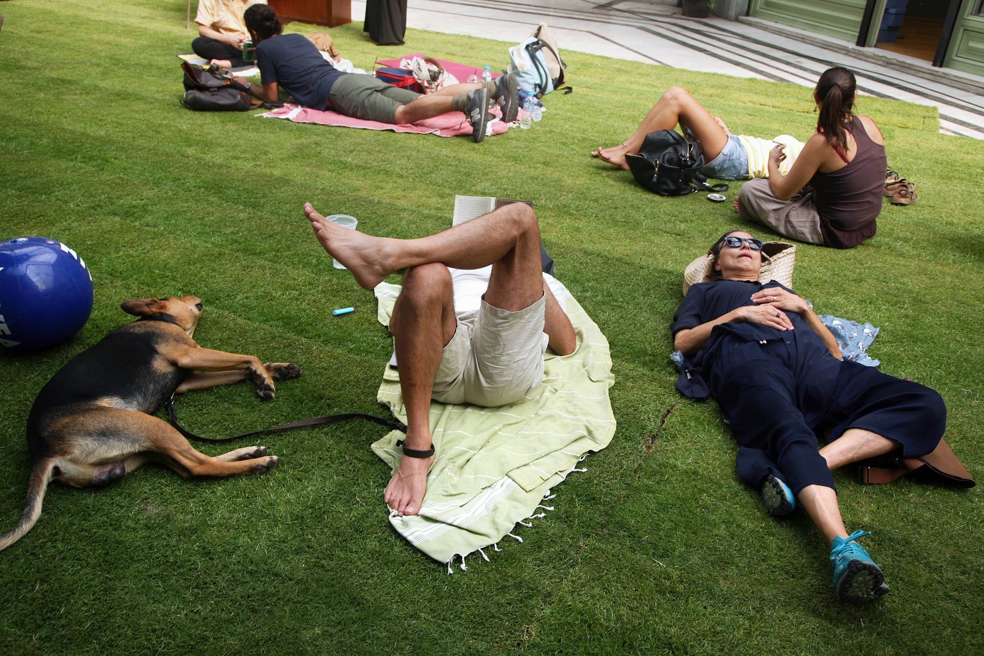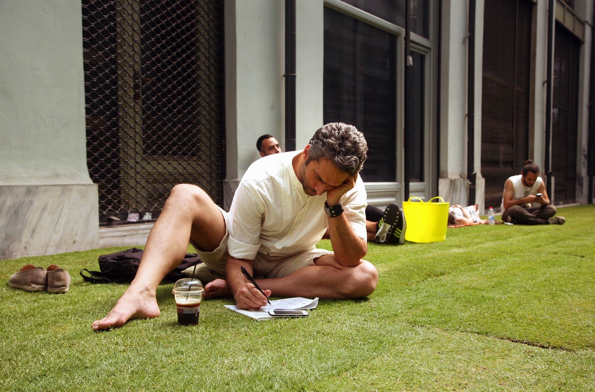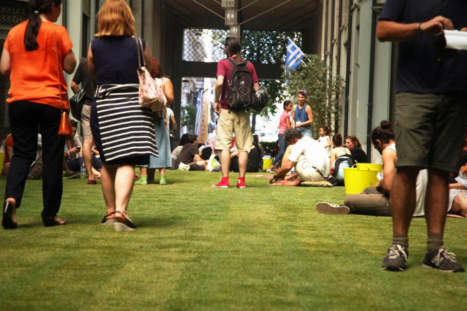 Για την ώρα πολλοί τρώνε, άλλοι κοιμούνται, δύο κοπέλες έχουν βγάλει λαπτοπ και δουλεύουν, άλλοι χαζεύουν τα κινητά τους και πιάνουν κουβέντα με αφορμή τον Κίτσο. Μια κυρία που θέλει να διασχίσει τη στοά, βγάζει τα παπούτσια, πατάει πάνω στο γρασίδι, τα ξαναφορά μόλις αυτό τελειώνει. Κάπου στο βάθος ακούγονται κόρνες αυτοκινήτων, εδώ μέσα ακούγεται Χατζιδάκις.